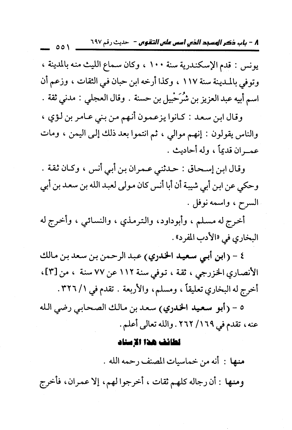 4 - (ابن أبي سعيد الخدري) عبد الرحمن بن سعد بن مالك الأنصاري الخزرجي، ثقة، توفي سنة 112 عن 77 سنة، من [3] أخرج له البخاري تعليقًا، ومسلم، والأربعة. تقدم في 1/ 326.