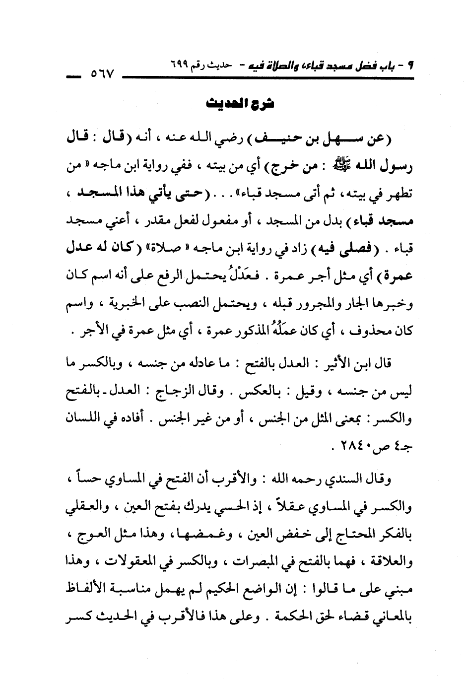 (عن سهل بن حنيف) - رضي الله عنه -، أنه (قال: قال رسول الله - صلى الله عليه وسلم -: من خرج) أي من بيته، ففي رواية ابن ماجه "من تطهر في بيته، ثم أتى مسجد قباء". . . (حتى يأتي هذا المسجد، مسجد قباء) بدل من المسجد، أو مفعول لفعل مقدر، أعني مسجد قباء. (فصلى فيه) زاد في رواية ابن ماجه "صلاة" (كان له عدل عمرة) أي مثل أجر عمرة. فعَدْلُ يحتمل الرفع على أنه اسم كان وخبرها الجار والمجرور قبله، ويحتمل النصب على الخبرية، واسم كان محذوف، أي كان عمَلُهُ المذكور عمرة، أي مثل عمرة في الأجر.