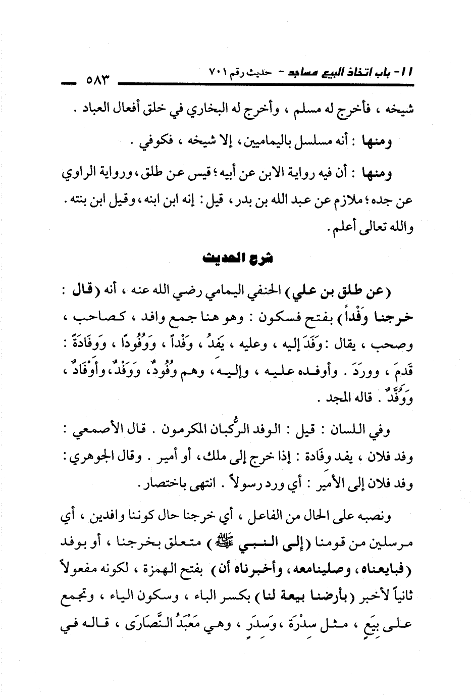 (عن طلق بن علي) الحنفي اليمامي - رضي الله عنه -، أنه (قال: خرجنا وَفْدًا) بفتح فسكون: وهو هنا جمع وافد، كصاحب، وصحب، يقال: وَفَدَ إليه، وعليه، يَفدُ، وَفْدًا، وَوُفُودًا، وَوفَادَةً: قَدِمَ، وورَدَ. وأوفده عليه، وإليه، وهم وُفُودٌ، وَوَفْدٌ، وأوفَادٌ، وَوُفَّدٌ. قاله المجد.