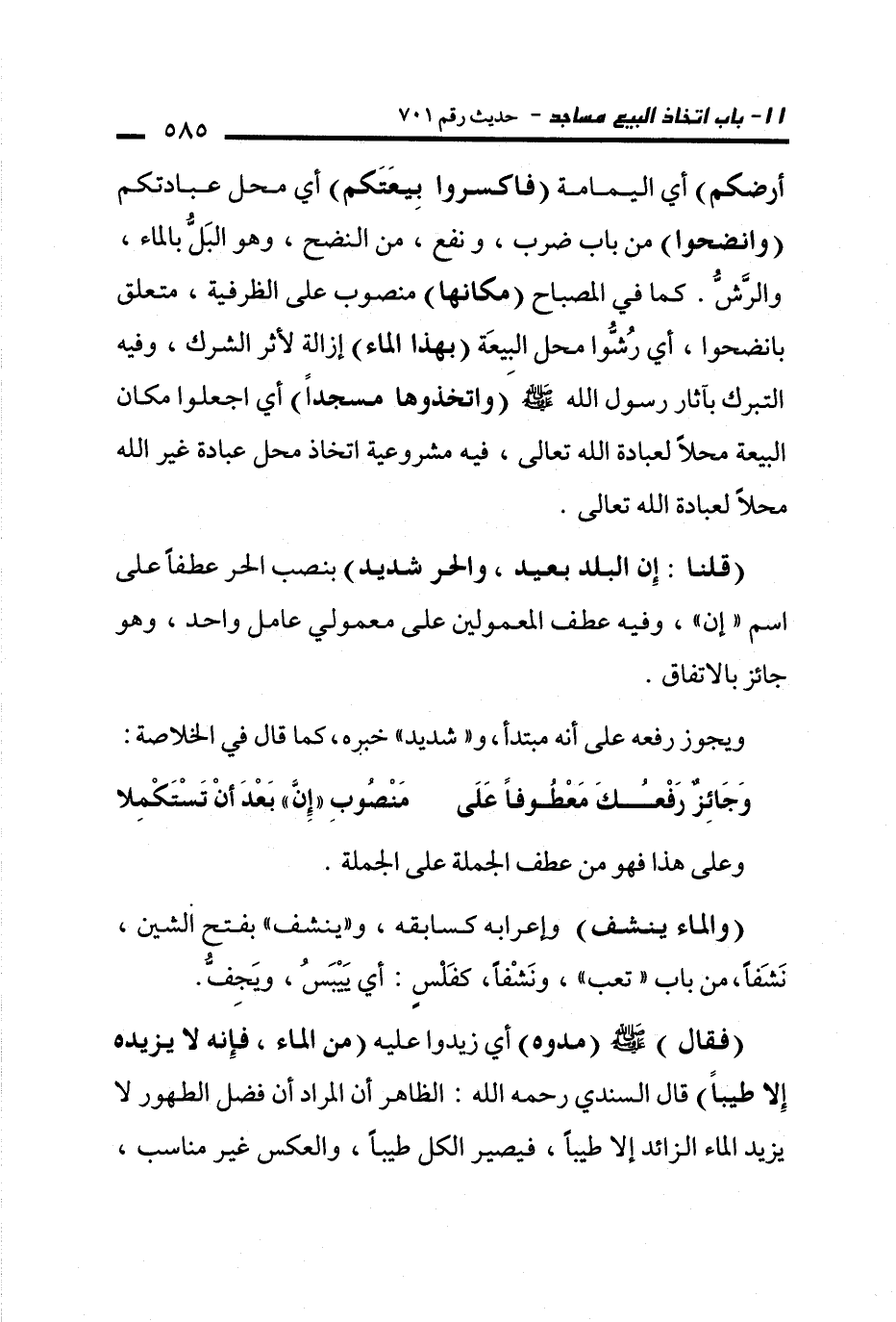 أرضكم) أي اليمامة (فاكسروا بِيعَتَكم) أي محل عبادتكم (وانضحوا) من باب ضرب، ونفع، من النضح، وهو البَلُّ بالماء، والرَّشُّ. كما في المصباح (مكانها) منصوب على الظرفية، متعلق بانضحوا، أي رُشُّوا محل البِيعَة (بهذا الماء) إزالة لأثر الشرك، وفيه التبرك بآثار رسول الله - صلى الله عليه وسلم - (واتخذوها مسجدًا) أي اجعلوا مكان البيعة محلًا لعبادة الله تعالى، فيه مشروعية اتخاذ محل عبادة غير الله محلًا لعبادة الله تعالى.