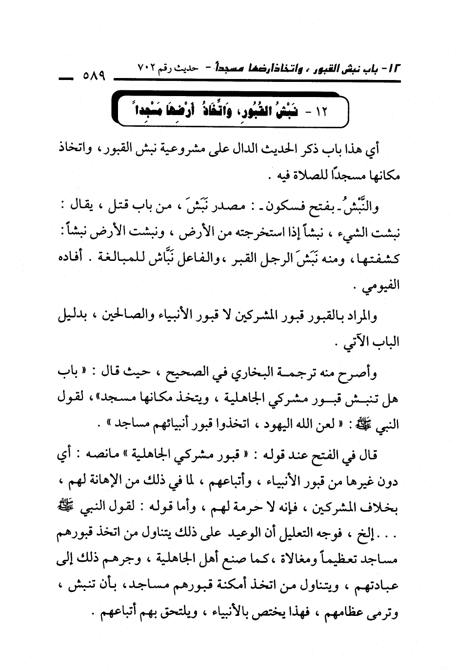وأصرح منه ترجمة البخاري في الصحيح، حيث قال: "باب هل تنبش قبور مشركي الجاهلية، ويتخذ مكانها مسجد"، لقول النبي - صلى الله عليه وسلم -: "لعن الله اليهود، اتخذوا قبور أنبيائهم مساجد".
