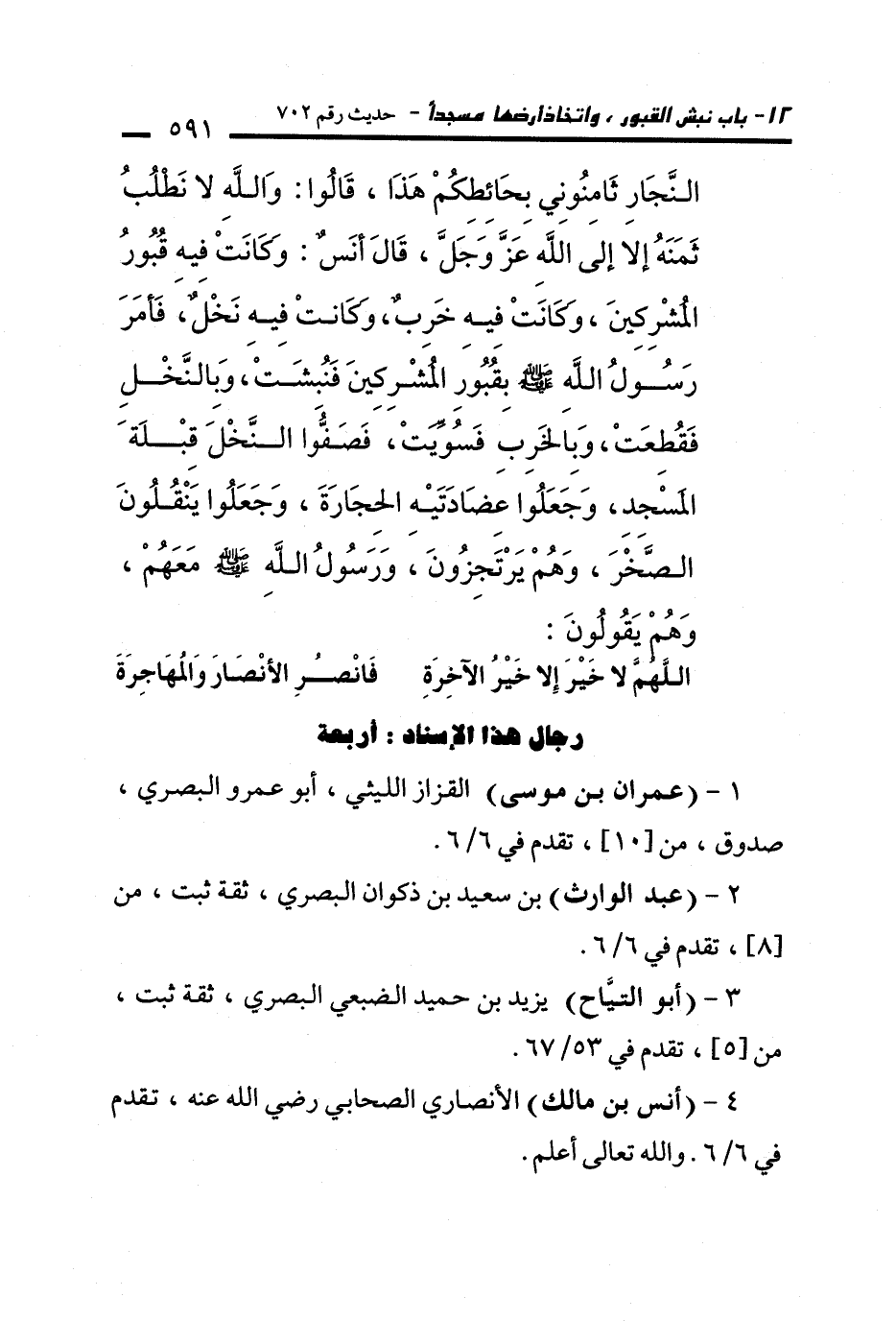 النَّجَّارِ ثَامِنُونِي بِحَائِطِكُمْ هَذَا، قَالُوا: وَاللَّهُ لاَ نَطْلُبُ ثَمَنَهُ إِلاَّ إِلَى اللَّهِ عَزَّ وَجَلَّ، قَالَ أَنَسٌ: وَكَانَتْ فِيهِ قُبُورُ الْمُشْرِكِينَ، وَكَانَتْ فِيهِ خَرِبٌ، وَكَانَ فِيهِ نَخْلٌ، فَأَمَرَ رَسُولُ اللَّهِ - صلى الله عليه وسلم - بِقُبُورِ الْمُشْرِكِينَ فَنُبِشَتْ، وَبِالنَّخْلِ فَقُطِعَتْ، وَبِالْخَرِبِ فَسُوِّيَتْ، فَصَفُّوا النَّخْلَ قِبْلَةَ الْمَسْجِدِ، وَجَعَلُوا عِضَادَتَيْهِ الْحِجَارَةَ، وَجَعَلُوا يَنْقُلُونَ الصَّخْرَ، وَهُمْ يَرْتَجِزُونَ، وَرَسُولُ اللَّهِ - صلى الله عليه وسلم - مَعَهُمْ، وَهُمْ يَقُولُونَ:
