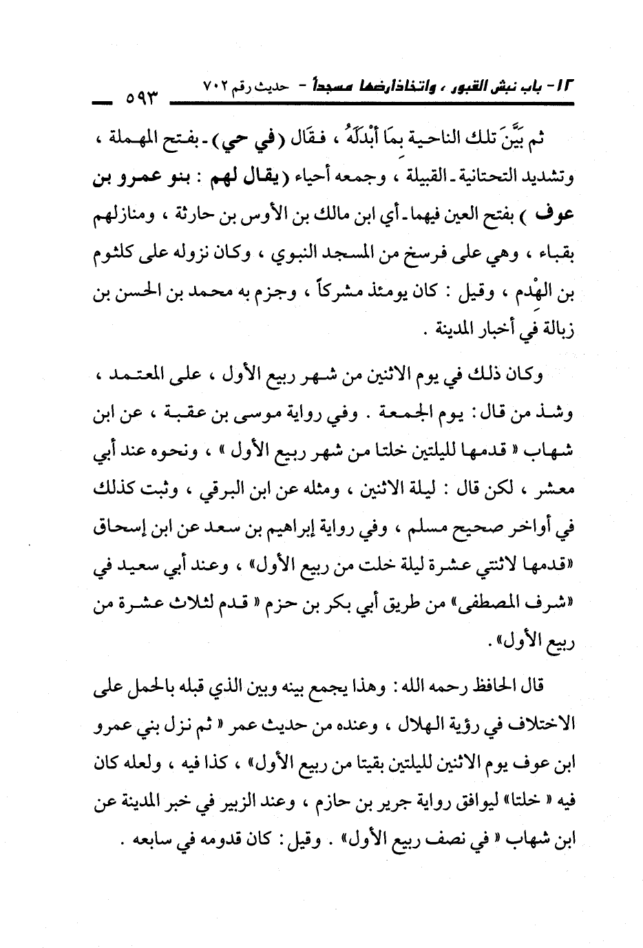 ثم بَيَّنَ تلك الناحية بمَا أبْدَلَهُ، فقَال (في حي) -بفتح المهملة، وتشديد التحتانية- القبيلة، وجمعه أحياء (يقال لهم: بنو عمرو بن عوف) بفتح العين فيهما- أي ابن مالك بن الأوس بن حارثة، ومنازلهم بقباء، وهي على فرسخ من المسجد النبوي، وكان نزوله على كلثوم بن الهْدِم، وقيل: كان يومئذ مشركًا، وجزم به محمد بن الحسن بن زبالة في أخبار المدينة.