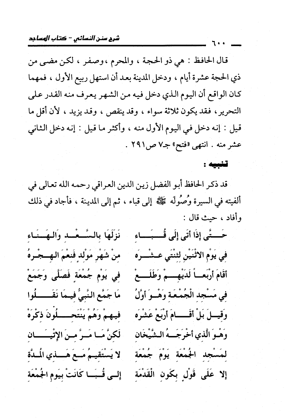 قد ذكر الحافظ أبو الفضل زين الدين العراقي رحمه الله تعالى في ألفيته في السيرة وُصُولَه - صلى الله عليه وسلم - إلى قباء، ثم إلى المدينة، فأجاد في ذلك وأفاد، حيث قال:
