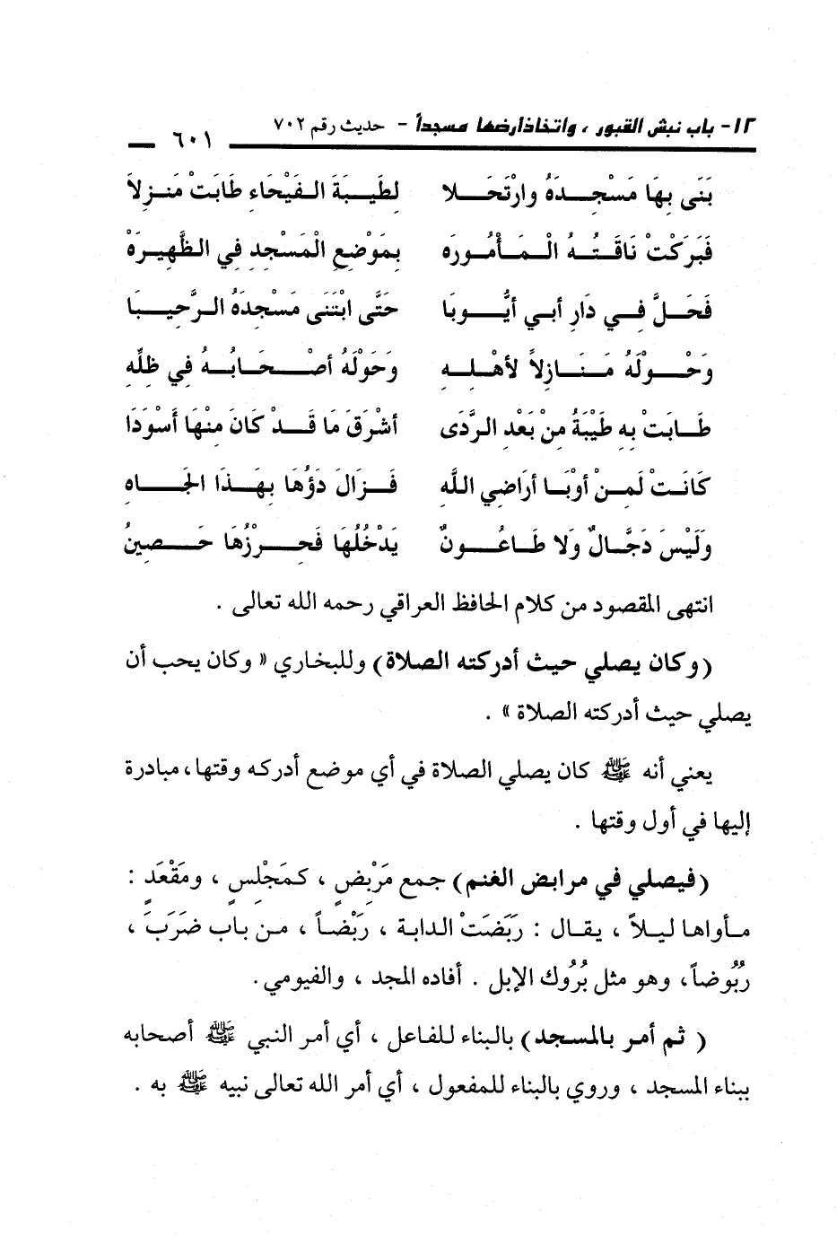 بَنَى بِهَا مَسْجِدَهُ وارْتَحَلا ... لِطَيبَةَ الفَيْحَاءِ طَابَتْ مَنزِلاَ