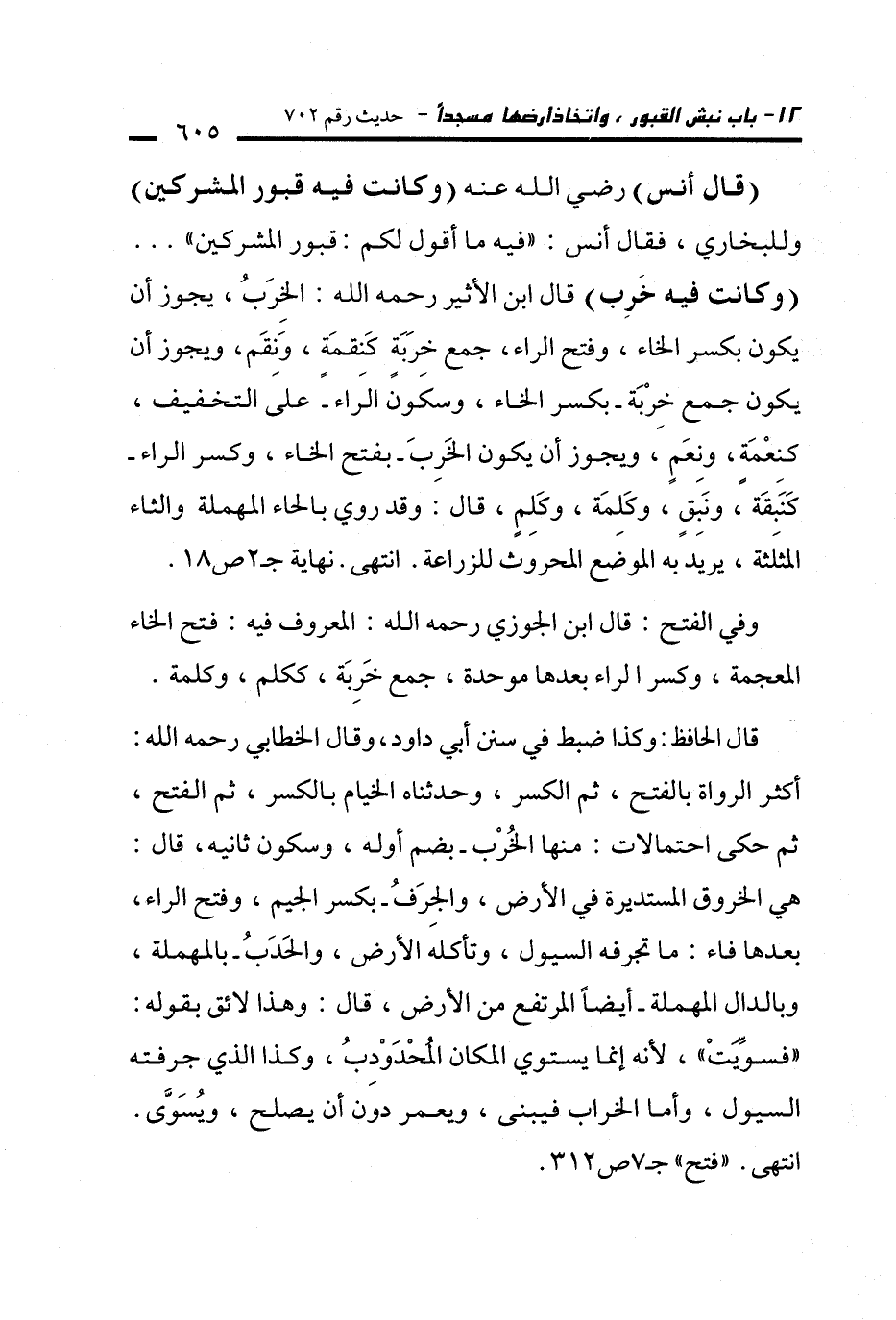 (قال أنس) - رضي الله عنه - (وكانت فيه قبور المشركين) وللبخاري، فقال أنس: "فيه ما أقول لكم: قبور المشركين". . . (وكانت فيه خَرِب) قال ابن الأثير -رحمه الله-: الخِرَبُ، يجوز أن يكون بكسر الخاء، وفتح الراء، جمع خرَبَة كَنِقمَةٍ، وَنِقَم، ويجوز أن يكون جمع خِرْبَة -بكسر الخاء، وسكَون الراء- على التخفيف، كنِعْمَة، ونِعَمٍ، ويجوز أن يكون الخَرِبَ -بفتح الخاء، وكسر الراء- كَنَبِقَة، ونَبِقٍ، وكَلِمَة، وكَلِمٍ، قال: وقد روي بالحاء المهملة والثاء المثلثة، يريد به الموضع المحروث للزراعة. انتهى. نهاية جـ 2 ص 18.