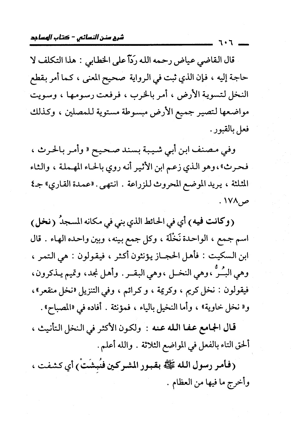 قال القاضي عياض -رحمه الله- رَدًّا على الخطابي: هذا التكلف لا حاجة إليه، فإن الذي ثبت في الرواية صحيح المعنى، كما أمر بقطع النخل لتسوية الأرض، أمر بالخرب، فرفعت رسومها، وسويت مواضعها لتصير جميع الأرض مبسوطة مستوية للمصلين، وكذلك فعل بالقبور.