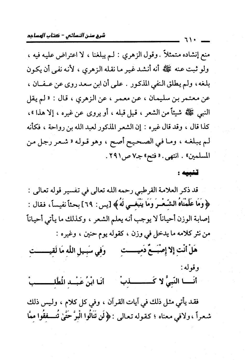منع إنشاده متمثلًا. وقول الزهري: لم يبلغنا، لا اعتراض عليه فيه، ولو ثبت عنه - صلى الله عليه وسلم - أنه أنشد غير ما نقله الزهري؛ لأنه نفى أن يكون بلغه، ولم يطلق النفي المذكور. على أن ابن سعد روى عن عفان، عن معتمر بن سليمان، عن معمر، عن الزهري، قال: "لم يقل النبي - صلى الله عليه وسلم - شيئًا من الشعر، قيل قبله، أو يروى عن غيره، إلا هذا"، كذا قال، وقد قال غيره: إن الشعر المذكور لعبد الله بن رواحة، فكأنه لم يبلغه، وما في الصحيح أصح، وهو قوله "شعر رجل من المسلمين". انتهى. "فتح" جـ 7 ص 291.
