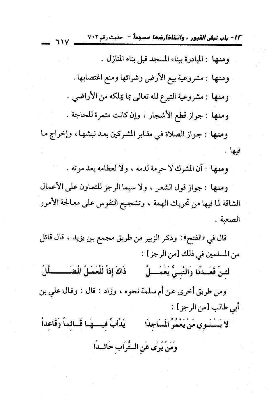 ومنها: جواز قول الشعر، ولا سيما الرجز للتعاون على الأعمال الشاقة لما فيها من تحريك الهمة، وتشجيع النفوس على معالجة الأمور الصعبة.