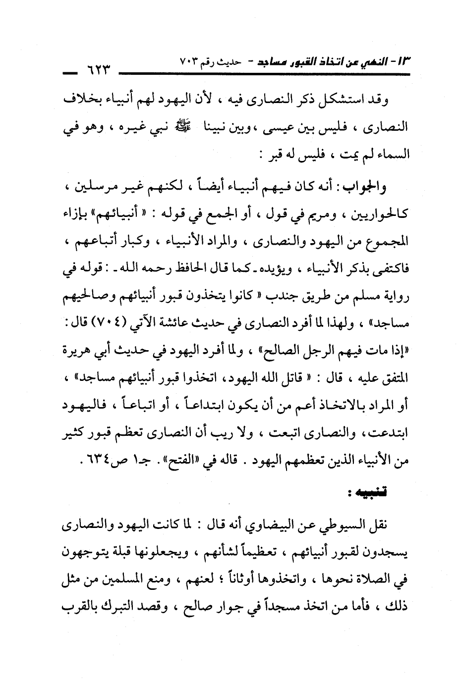 والجواب: أنه كان فيهم أنبياء أيضًا، لكنهم غير مرسلين، كالحواريين، ومريم في قول، أو الجمع في قوله: "أنبيائهم" بإزاء المجموع من اليهود والنصارى، والمراد الأنبياء، وكبار أتباعهم، فاكتفى بذكر الأنبياء، ويؤيده -كما قال الحافظ -رحمه الله-: قوله في رواية مسلم من طريق جندب "كانوا يتخذون قبور أنبيائهم وصالحيهم مساجد"، ولهذا لما أفرد النصارى في حديث عائشة الآتي (704) قال: "إذا مات فيهم الرجل الصالح"، ولما أفرد اليهود في حديث أبي هريرة المتفق عليه، قال: "قاتل الله اليهود، اتخذوا قبور أنبيائهم مساجد"، أو المراد بالاتخاذ أعم من أن يكون ابتداعًا، أو اتباعًا، فاليهود ابتدعت، والنصارى اتبعت، ولا ريب أن النصارى تعظم قبور كثير من الأنبياء الذين تعظمهم اليهود. قاله في "الفتح". جـ 1 ص 634.