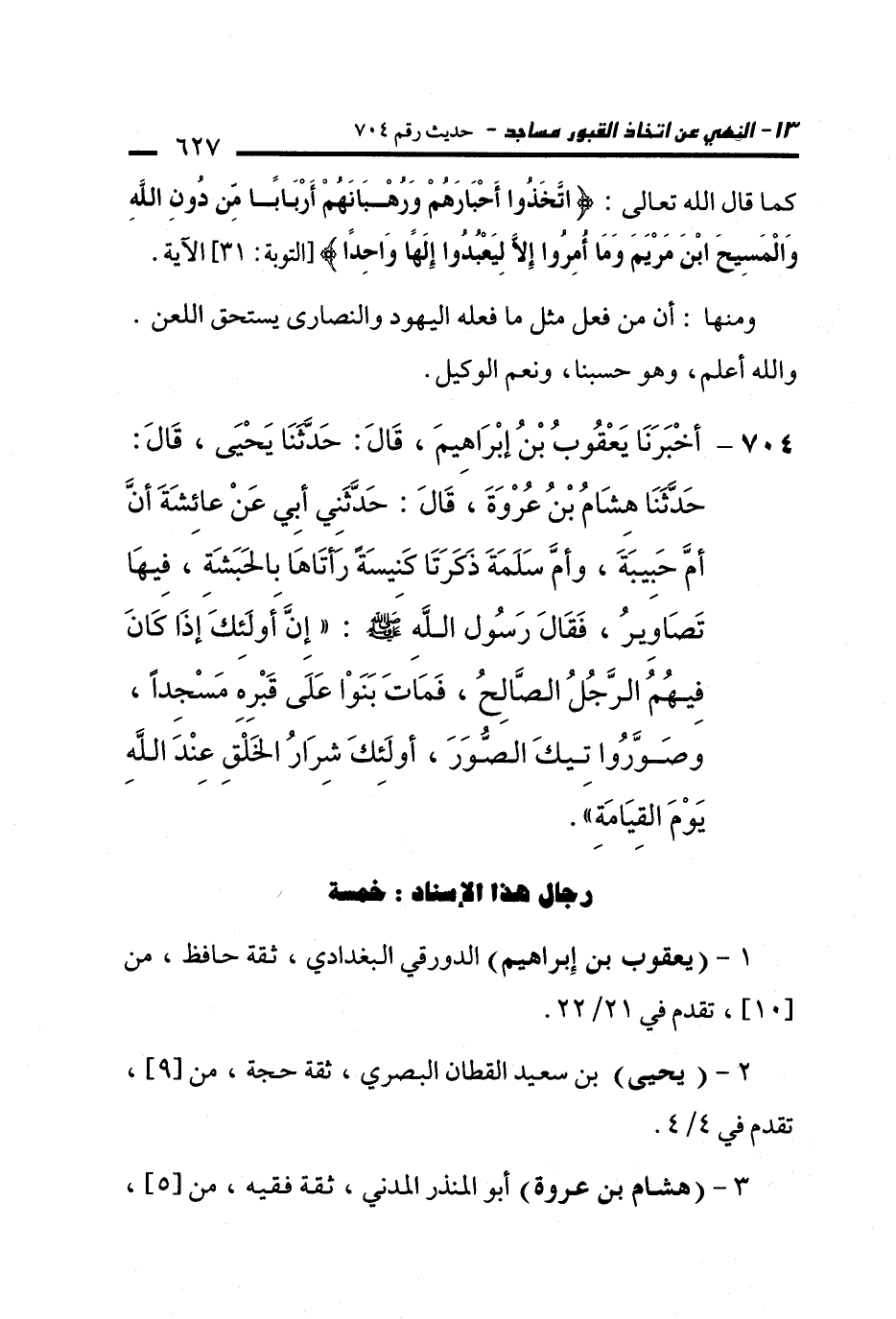 704 - أَخْبَرَنَا يَعْقُوبُ بْنُ إِبْرَاهِيمَ، قَالَ: حَدَّثَنَا يَحْيَى، قَالَ: حَدَّثَنَا هِشَامُ بْنُ عُرْوَةَ، قَالَ: حَدَّثَنِي أَبِي عَنْ عَائِشَةَ أَنَّ أُمَّ حَبِيبَةَ، وَأُمَّ سَلَمَةَ ذَكَرَتَا كَنِيسَةً رَأَتَاهَا بِالْحَبَشَةِ، فِيهَا تَصَاوِيرُ، فَقَالَ رَسُولُ اللَّهِ - صلى الله عليه وسلم -: "إِنَّ أُولَئِكَ إِذَا كَانَ فِيهِمُ الرَّجُلُ الصَّالِحُ، فَمَاتَ بَنَوْا عَلَى قَبْرِهِ مَسْجِدًا، وَصَوَّرُوا تِيكَ الصُّوَرَ، أُولَئِكَ شِرَارُ الْخَلْقِ عِنْدَ اللَّهِ يَوْمَ الْقِيَامَةِ".