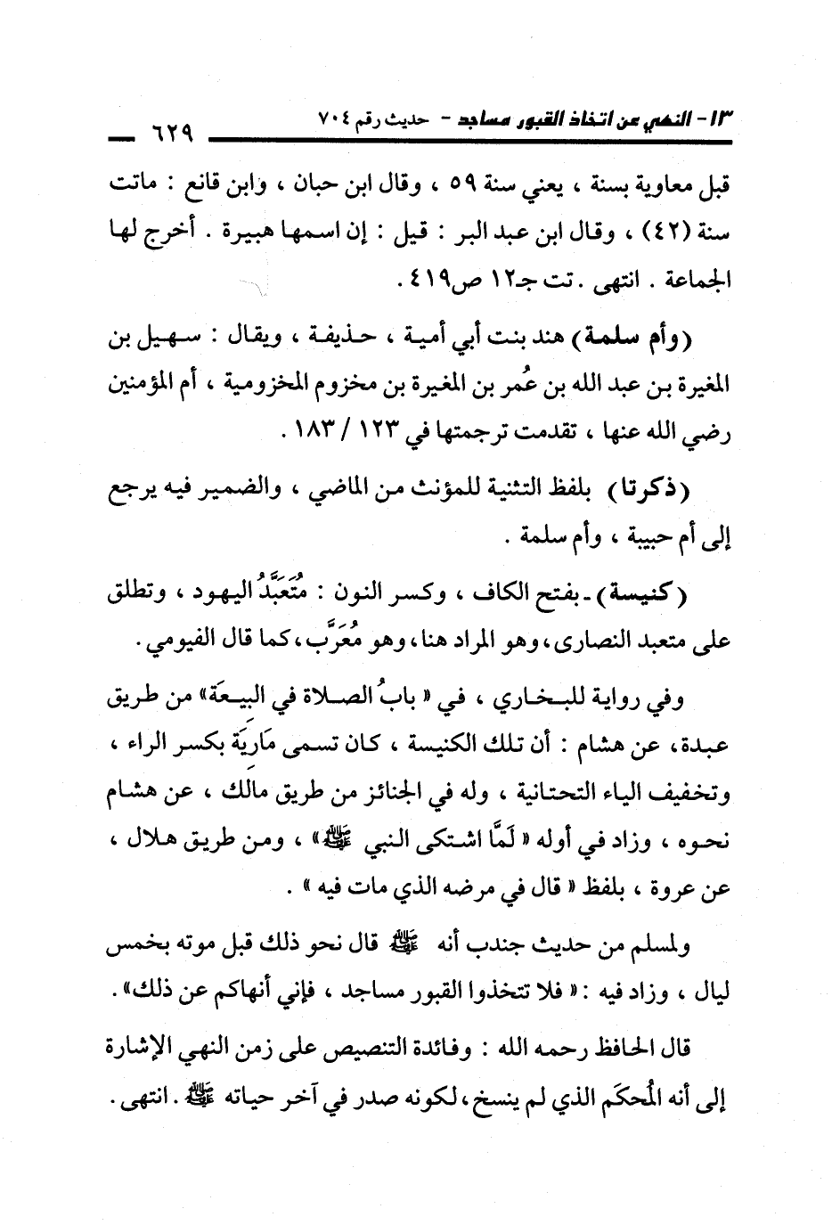 ولمسلم من حديث جندب أنه - صلى الله عليه وسلم - قال نحو ذلك قبل موته بخمس ليال، وزاد فيه: "فلا تتخذوا القبور مساجد، فإني أنهاكم عن ذلك".