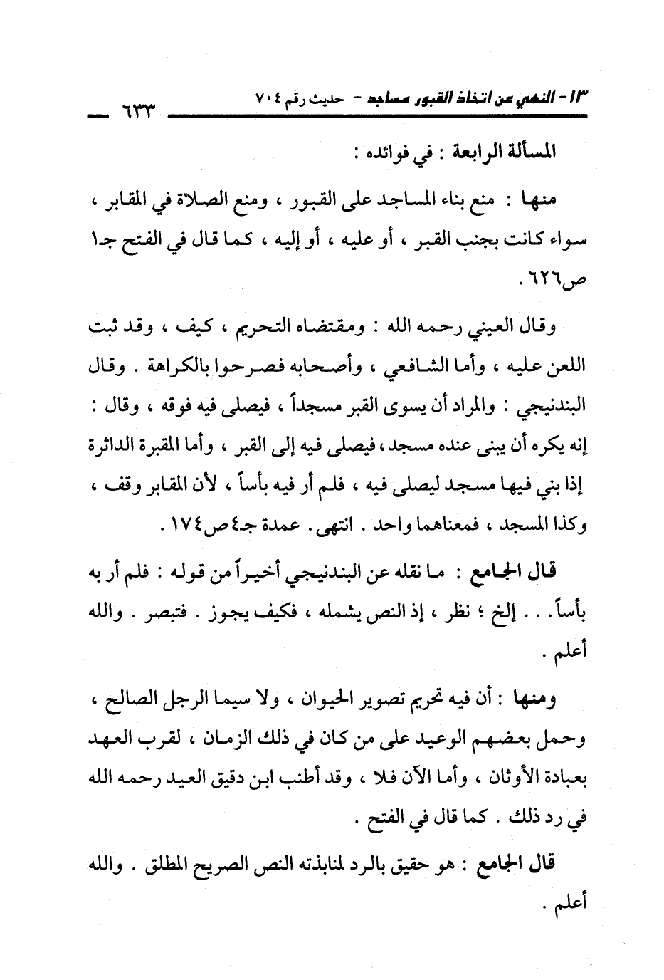 وقال العيني -رحمه الله-: ومقتضاه التحريم، كيف، وقد ثبت اللعن عليه، وأما الشافعي، وأصحابه فصرحوا بالكراهة. وقال البندنيجي: والمراد أن يسوى القبر مسجدًا، فيصلى فيه فوقه، وقال: إنه يكره أن يبنى عنده مسجد، فيصلى فيه إلى القبر، وأما المقبرة الداثرة إذا بني فيها مسجد ليصلى فيه، فلم أر فيه بأسًا؛ لأن المقابر وقف، وكذا المسجد، فمعناهما واحد. انتهى. عمدة جـ 4 ص 174.