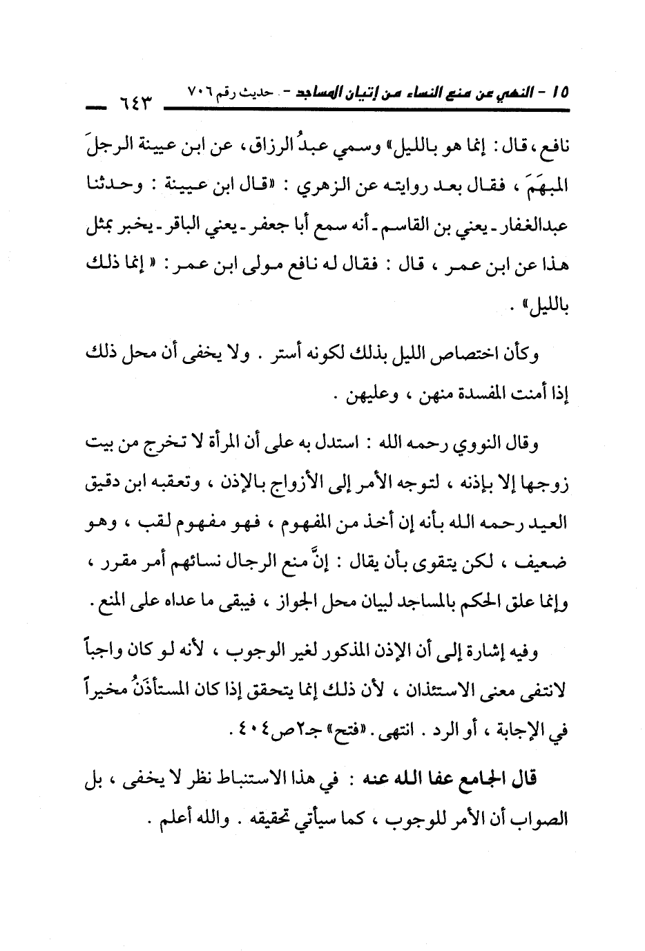 وقال النووي -رحمه الله-: استدل به على أن المرأة لا تخرج من بيت زوجها إلا بإذنه، لتوجه الأمر إلى الأزواج بالإذن، وتعقبه ابن دقيق العيد -رحمه الله- بأنه إن أخذ من المفهوم، فهو مفهوم لقب، وهو ضعيف، لكن يتقوى بأن يقال: إنَّ منع الرجال نسائهم أمر مقرر، وإنما علق الحكم بالمساجد لبيان محل الجواز، فيبقى ما عداه على المنع.