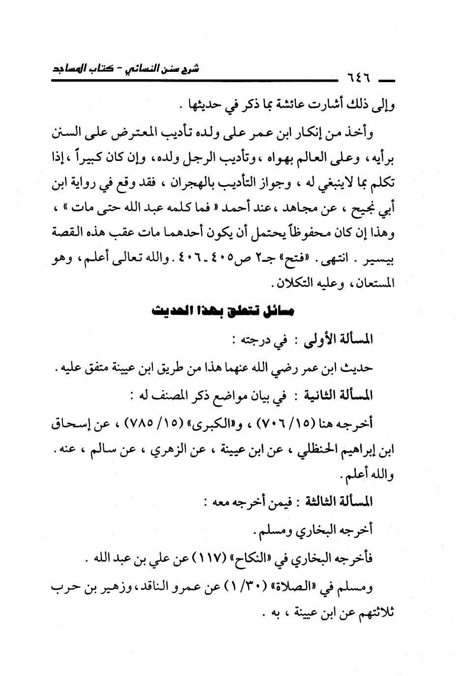 وأخذ من إنكار ابن عمر على ولده تأديب المعترض على السنن برأيه، وعلى العالم بهواه، وتأديب الرجل ولده، وإن كان كبيرًا، إذا تكلم بما لا ينبغي له، وجواز التأديب بالهجران، فقد وقع في رواية ابن أبي نجيح، عن مجاهد، عند أحمد "فما كلمه عبد الله حتى مات"، وهذا إن كان محفوظًا يحتمل أن يكون أحدهما مات عقب هذه القصة بيسير. انتهى. "فتح" جـ 2 ص 405 - 406. والله تعالى أعلم، وهو المستعان، وعليه التكلان.