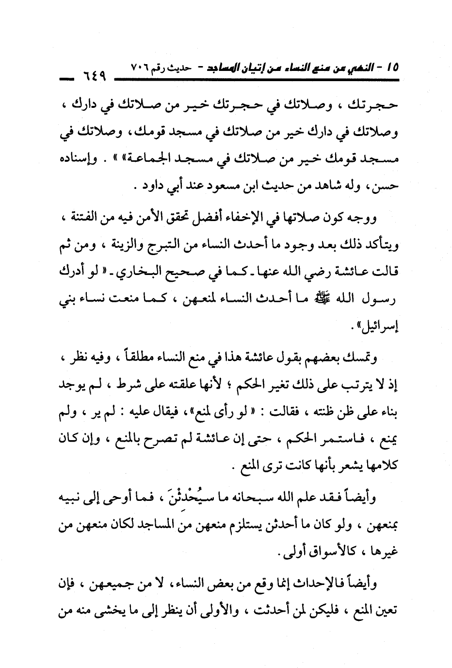 ووجه كون صلاتها في الإخفاء أفضل تحقق الأمن فيه من الفتنة، ويتأكد ذلك بعد وجود ما أحدث النساء من التبرج والزينة، ومن ثم قالت عائشة - رضي الله عنها - -كما في صحيح البخاري- "لو أدرك رسول الله - صلى الله عليه وسلم - ما أحدث النساء لمنعهن، كما منعت نساء بني إسرائيل".