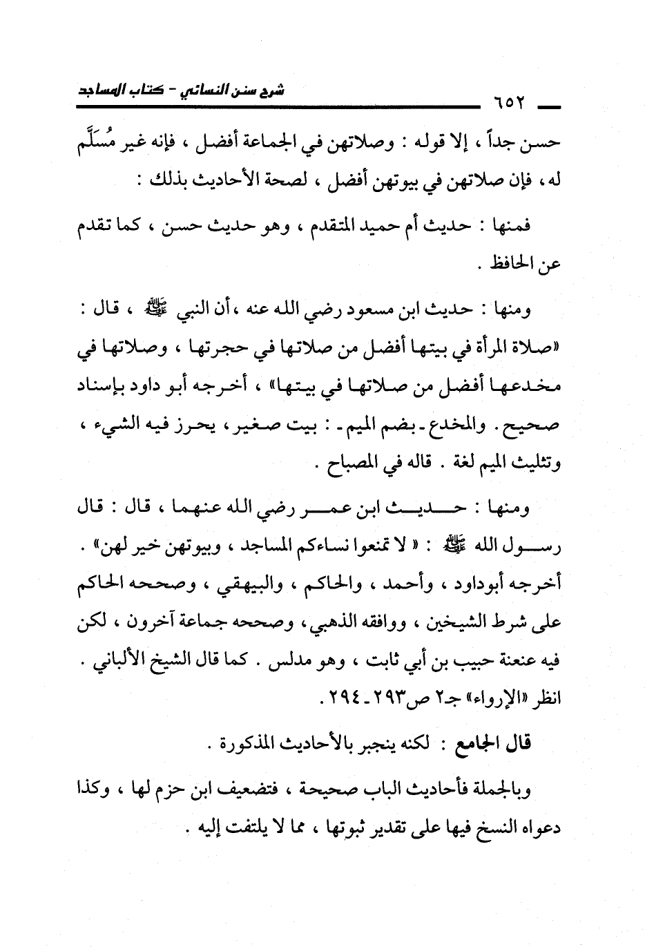 ومنها: حديث ابن عمر - رضي الله عنهما -، قال: قال رسول الله - صلى الله عليه وسلم -: "لا تمنعوا نساءكم المساجد، وبيوتهن خير لهن". أخرجه أبو داود، وأحمد، والحاكم، والبيهقي، وصححه الحاكم على شرط الشيخين، ووافقه الذهبي، وصححه جماعة آخرون، لكن فيه عنعنة حبيب بن أبي ثابت، وهو مدلس. كما قال الشيخ الألباني. انظر "الإرواء" جـ 2 ص 293 - 294.