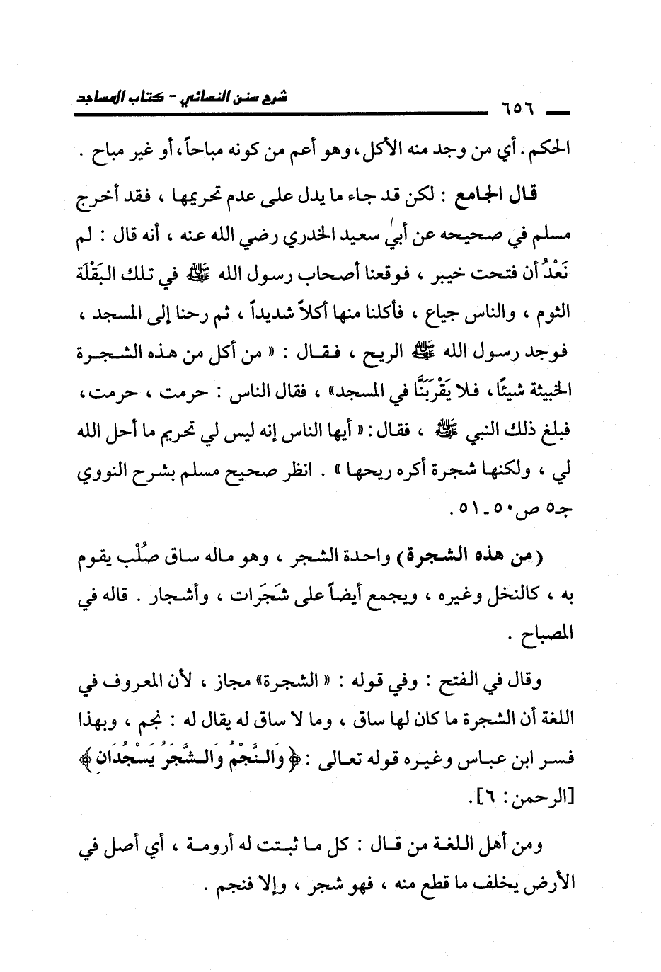 وقال في الفتح: وفي قوله: "الشجرة" مجاز؛ لأن المعروف في اللغة أن الشجرة ما كان لها ساق، وما لا ساق له يقال له: نجم، وبهذا فسر ابن عباس وغيره قوله تعالى: {وَالنَّجْمُ وَالشَّجَرُ يَسْجُدَانِ} [الرحمن: 6].