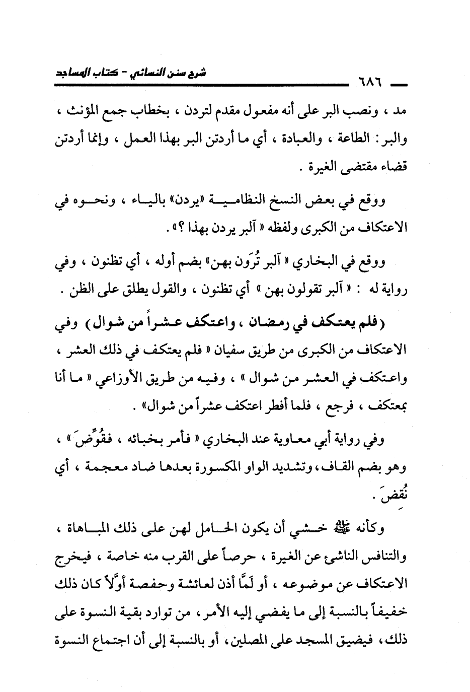 (فلم يعتكف في رمضان، واعتكف عشرًا من شوال) وفي الاعتكاف من الكبرى من طريق سفيان "فلم يعتكف في ذلك العشر، واعتكف في العشر من شوال"، وفيه من طريق الأوزاعي "ما أنا بمعتكف، فرجع، فلما أفطر اعتكف عشرًا من شوال".