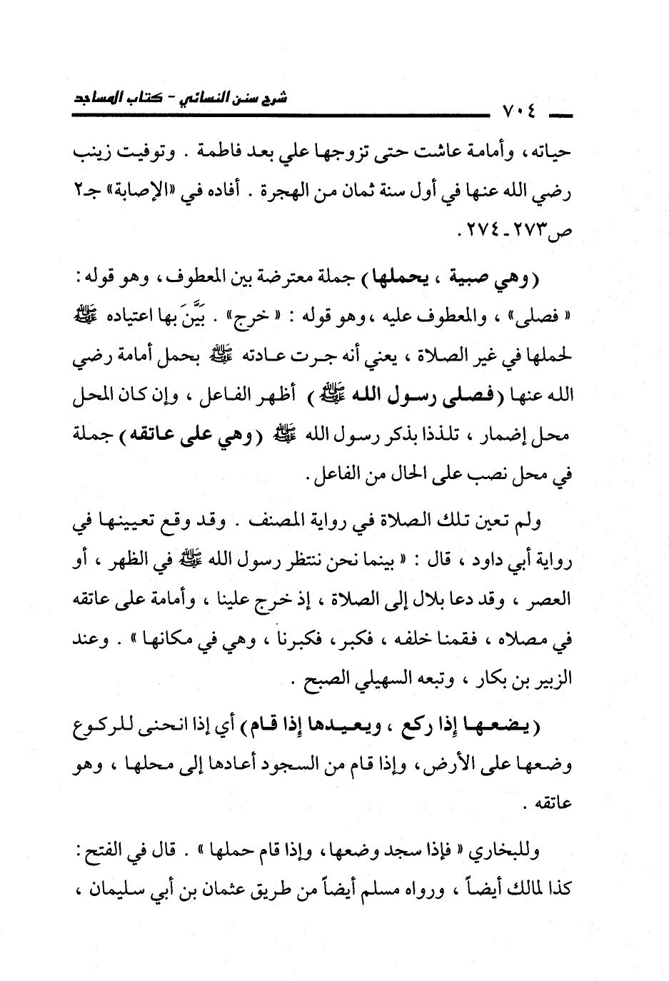 وللبخاري "فإذا سجد وضعها، وإذا قام حملها". قال في الفتح: كذا لمالك أيضًا، ورواه مسلم أيضًا من طريق عثمان بن أبي سليمان،