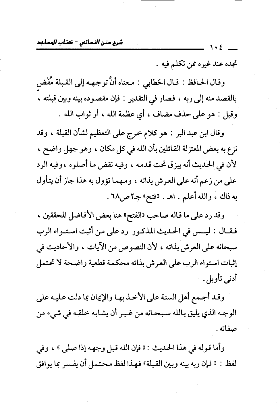 وقال ابن عبد البر: هو كلام خرج على التعظيم لشأن القبلة، وقد نزع به بعض المعتزلة القائلين بأن الله في كل مكان، وهو جهل واضح، لأن في الحديث أنه يبزق تحت قدمه، وفيه نقض ما أصلوه، وفيه الرد على من زعم أنه على العرش بذاته، ومهما تؤول به هذا جاز أن يتأول به ذاك، والله أعلم. اهـ. "فتح" جـ 2 ص 68.