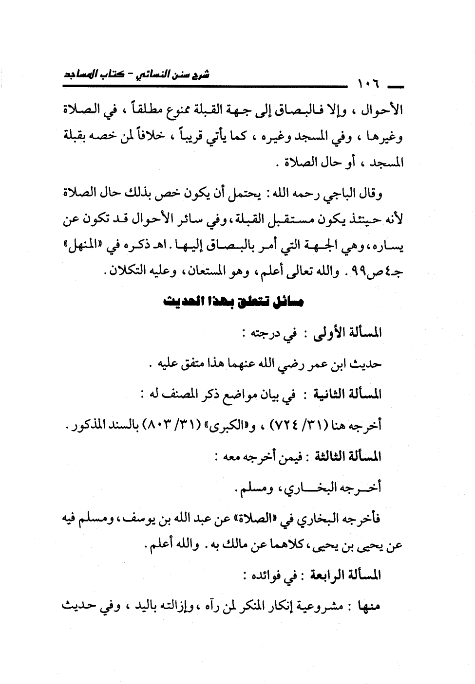 الأحوال، وإلا فالبصاق إلى جهة القبلة ممنوع مطلقًا، في الصلاة وغيرها، وفي المسجد وغيره، كما يأتي قريبًا، خلافًا لمن خصه بقبلة المسجد، أو حال الصلاة.