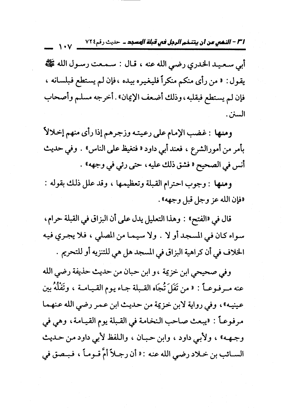 قال في "الفتح": وهذا التعليل يدل على أن البزاق في القبلة حرام، سواء كان في المسجد أو لا. ولاسيما من المصلي، فلا يجري فيه الخلاف في أن كراهية البزاق في المسجد هل هي للتنزيه أو للتحريم.