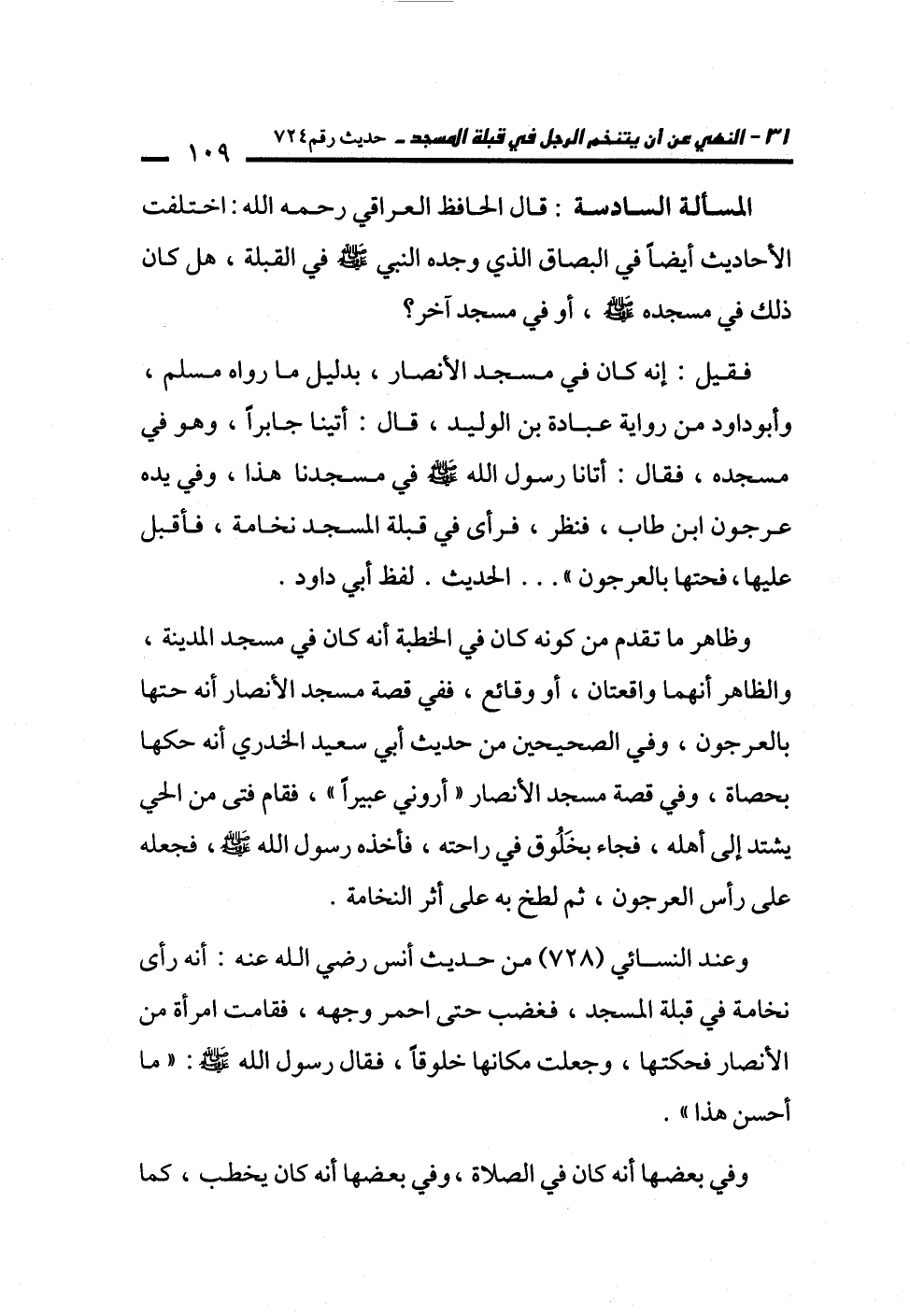 المسألة السادسة: قال الحافظ العراقي رحمه الله: اختلفت الأحاديث أيضًا في البصاق الذي وجده النبي -صلى الله عليه وسلم- في القبلة، هل كان ذلك في مسجده -صلى الله عليه وسلم-، أو في مسجد آخر؟