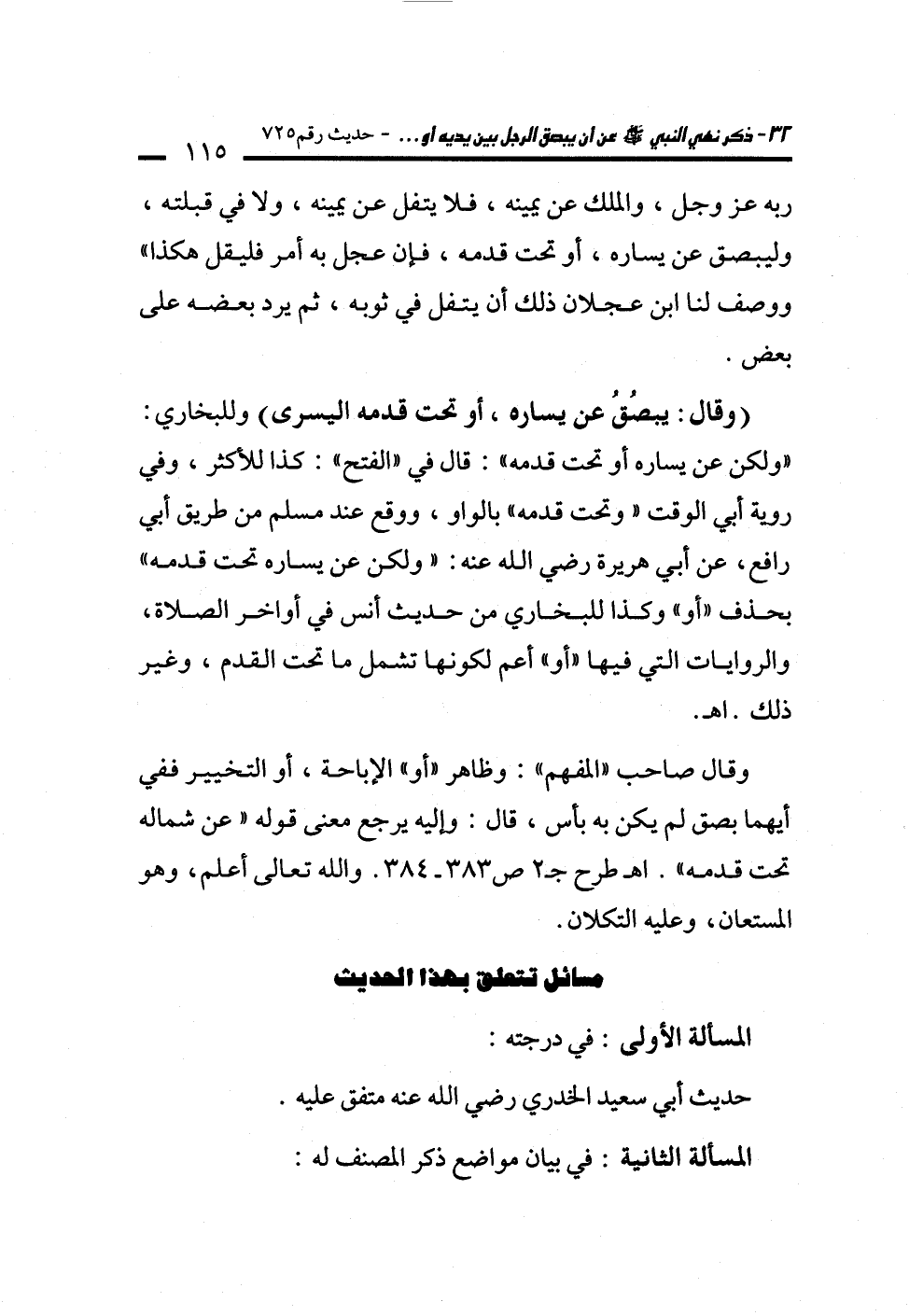 وقال صاحب "المفهم": وظاهر"أو" الإباحة، أو التخيير ففي أيهما بصق لم يكن به بأس، قال: وإليه يرجع معنى قوله "عن شماله تحت قدمه". اهـ طرح جـ 2 ص 383 - 384. والله تعالى أعلم، وهو المستعان، وعليه التكلان.