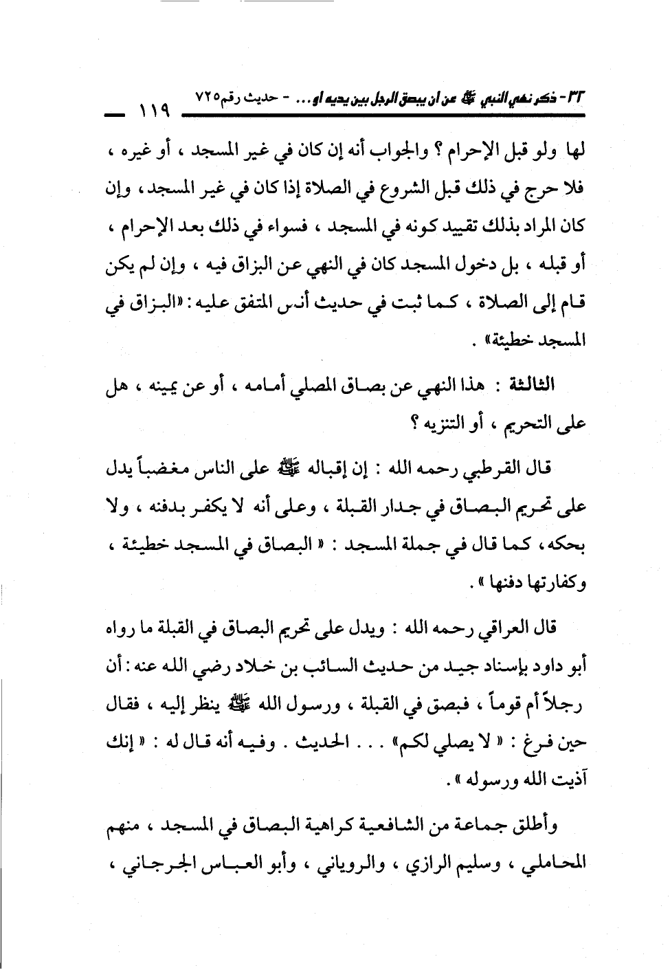 قال العراقي رحمه الله: ويدل على تحريم البصاق في القبلة ما رواه أبو داود بإسناد جيد من حديث السائب بن خلاد رضي الله عنه: أن رجلًا أم قومًا، فبصق في القبلة، ورسول الله -صلى الله عليه وسلم- ينظر إليه، فقال حين فرغ: "لا يصلي لكم" ... الحديث. وفيه أنه قال له: "إنك آذيت الله ورسوله".