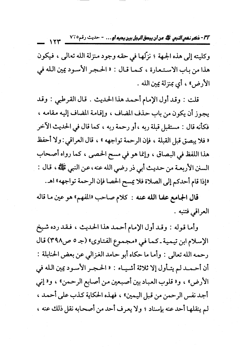 وأما قوله: وقد أول الإمام أحمد هذا الحديث، فقد رده شيخ الإِسلام ابن تيمية -كما في "مجموع الفتاوى" (جـ 5 ص 398) قال رحمه الله تعالى: وأما ما حكاه أبو حامد الغزالي عن بعض الحنابلة: أن أحمد لم يتأول إلا ثلاثة أشياء: "الحجر الأسود يمين الله في الأرض"، و"قلوب العباد بين أصبعين من أصابع الرحمن"، و"إني أجد نفس الرحمن من قبل اليمين"، فهذه الحكاية كذب على أحمد، لم ينقلها أحد عنه بإسناد, ولا يعرف أحد من أصحابه نقل ذلك عنه،