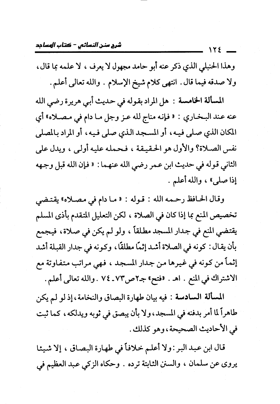 المسألة الخامسة: هل المراد بقوله في حديث أبي هريرة رضي الله عنه عند البخاري: "فإنه مناج لله عَزَّ وَجَلَّ ما دام في مصلاه" أي المكان الذي صلى فيه، أو المسجد الذي صلى فيه، أو المراد بالمصلى نفس الصلاة؟ والأول هو الحقيقة، فحملة عليه أولى، ويدل على الثاني قوله في حديث ابن عمر رضي الله عنهما: "فإن الله قبل وجهه إذا صلى"، والله أعلم.