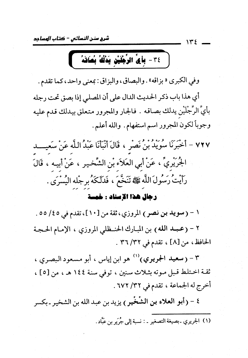 727 - أَخْبَرَنَا سُوَيْدُ بْنُ نَصْرٍ، قَالَ أَنْبَأَنَا عَبْدُ اللَّهِ عَنْ سَعِيدٍ الْجُرَيْرِيِّ، عَنْ أَبِي الْعَلاَءِ بْنِ الشِّخِّيرِ، عَنْ أَبِيهِ، قَالَ رَأَيْتُ رَسُولَ اللَّهِ -صلى الله عليه وسلم- تَنَخَّعَ، فَدَلَكَهُ بِرِجْلِهِ الْيُسْرَى.