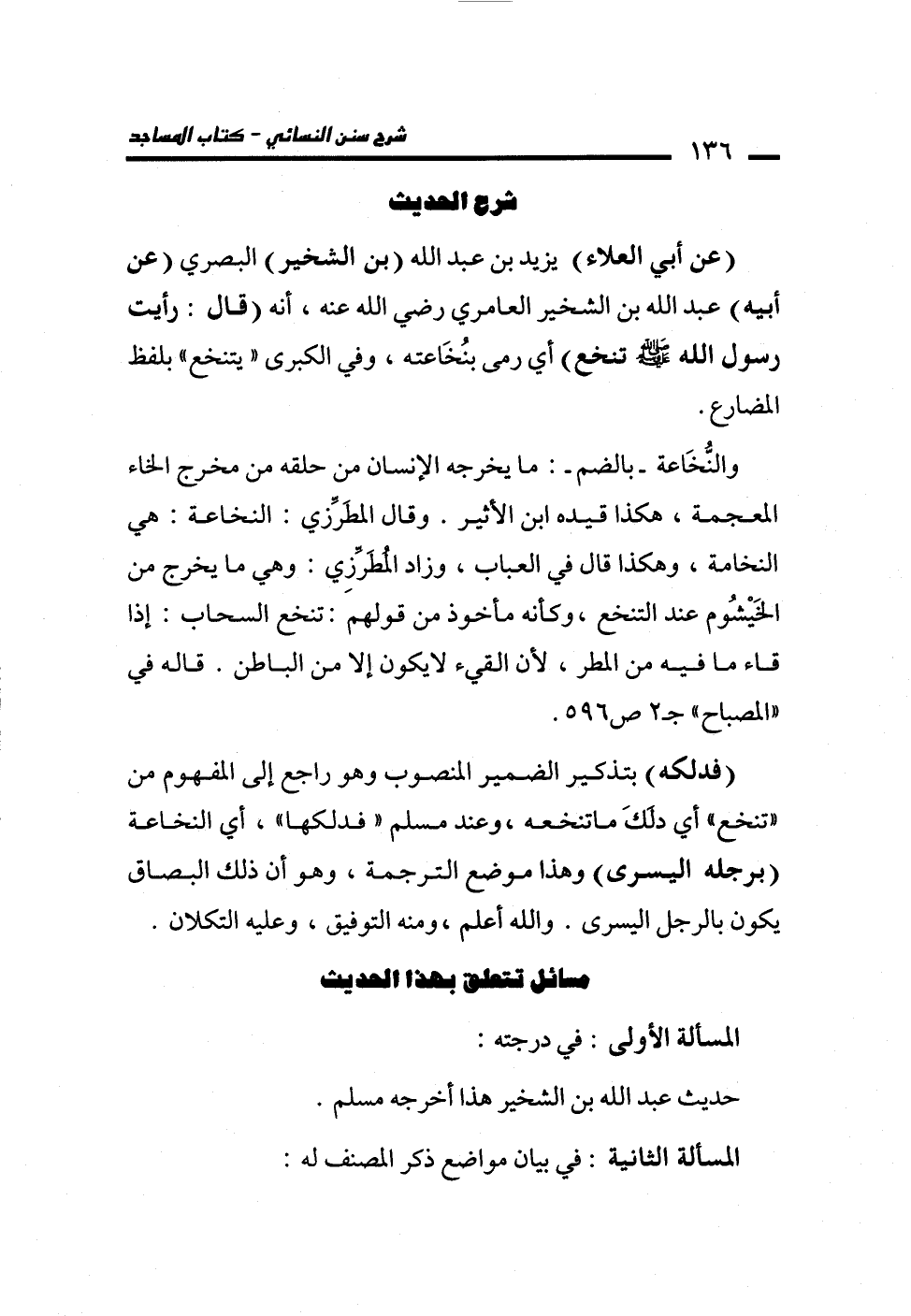 (عن أبي العلاء) يزيد بن عبد الله (بن الشخير) البصري (عن أبيه) عبد الله بن الشخير العامري رضي الله عنه، أنه (قال: رأيت رسول الله -صلى الله عليه وسلم- تنخع) أي رمى بنُخَاعته، وفي الكبرى "يتنخع" بلفظ المضارع.
