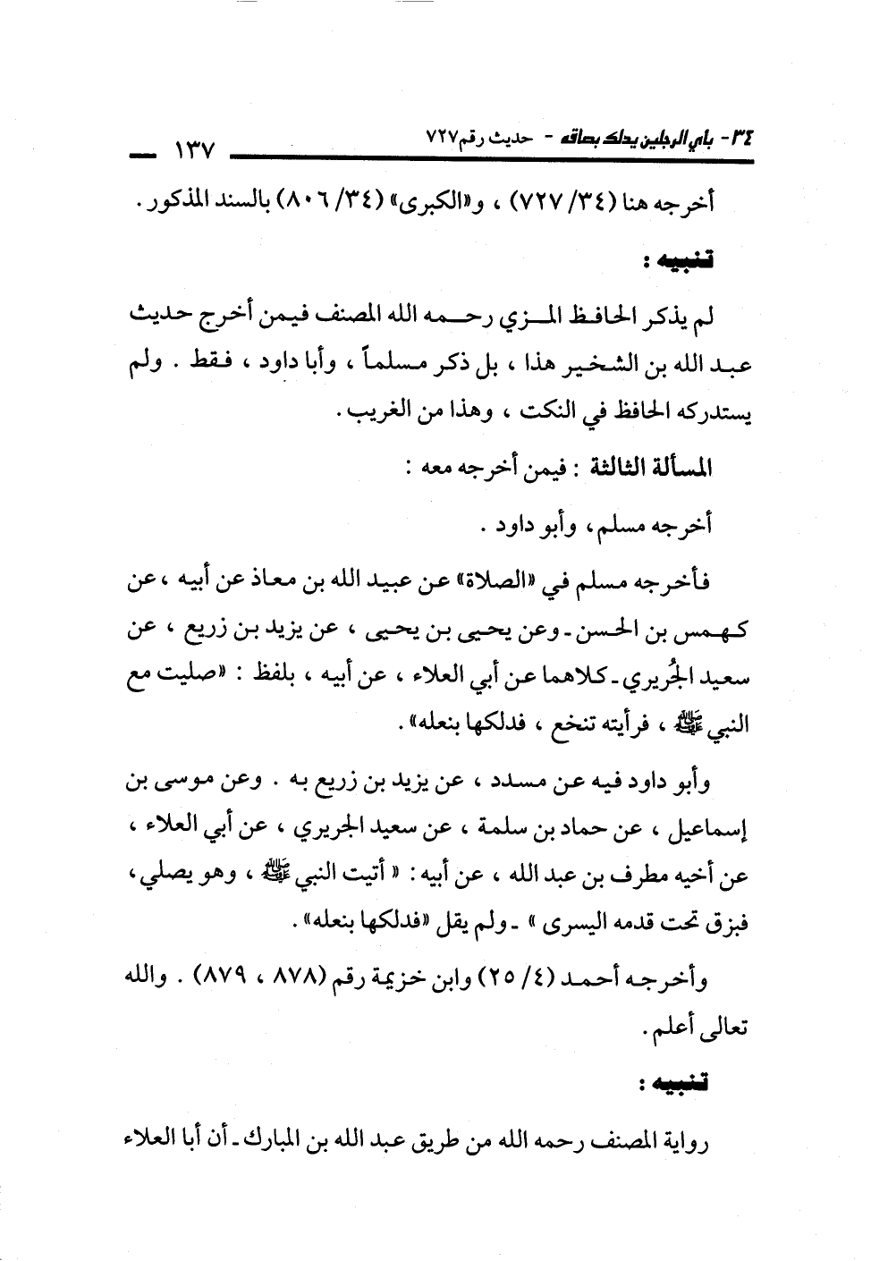 وأبو داود فيه عن مسدد، عن يزيد بن زريع به. وعن موسى بن إسماعيل، عن حماد بن سلمة، عن سعيد الجريري، عن أبي العلاء، عن أخيه مطرف بن عبد الله، عن أبيه: "أتيت النبي -صلى الله عليه وسلم-، وهو يصلي، فبزق تحت قدمه اليسرى" - ولم يقل "فدلكها بنعله".
