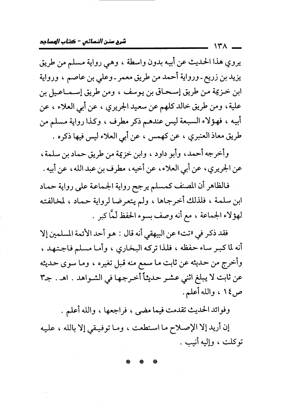 فالظاهر أن المصنف كمسلم يرجح رواية الجماعة على رواية حماد ابن سلمة، فلذلك أخرجاها, ولم يتعرضا لرواية حماد، لمخالفته لهؤلاء الجماعة، مع أنه وصف بسوء الحفظ لَمَّا كبر.