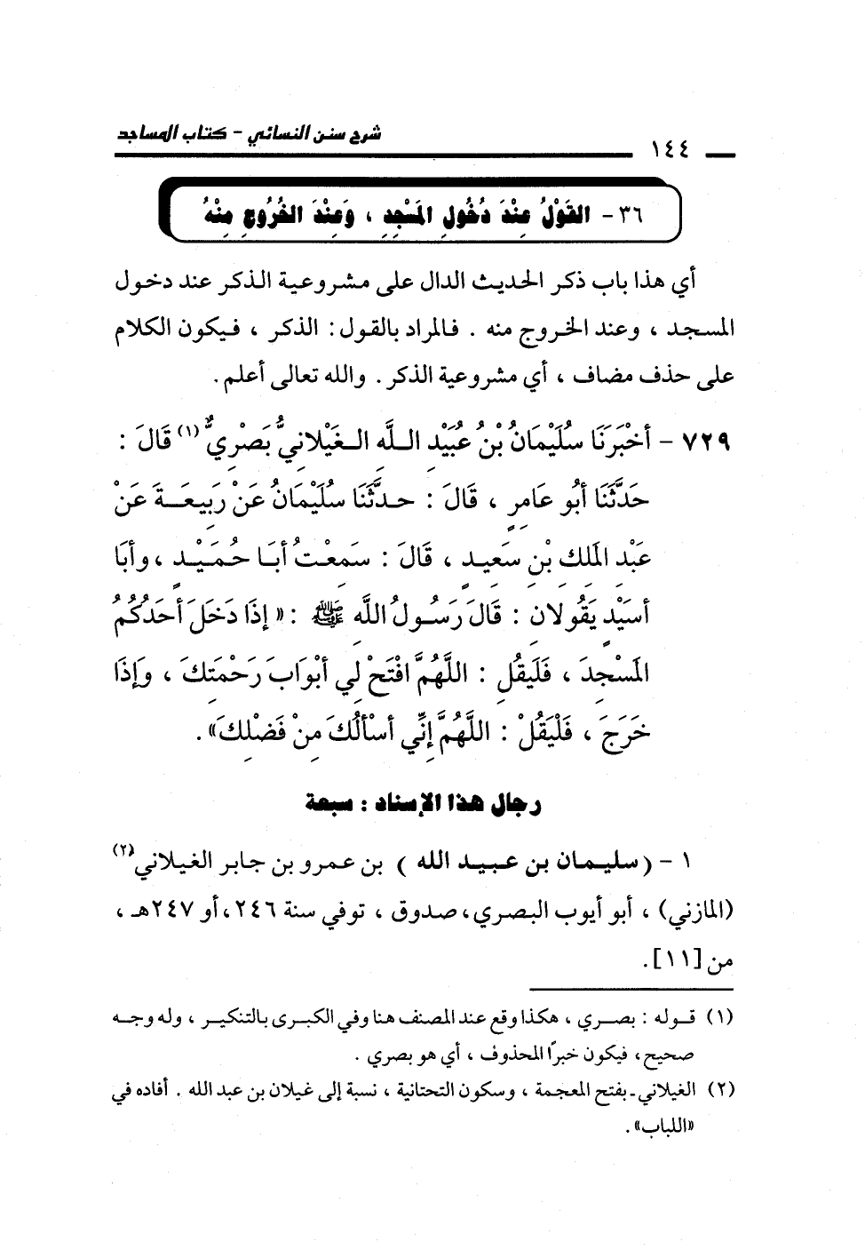 729 - أَخْبَرَنَا سُلَيْمَانُ بْنُ عُبَيْدِ اللَّهِ الْغَيْلاَنِيُّ بَصْرِيٌّ (¬1) قَالَ: حَدَّثَنَا أَبُو عَامِرٍ، قَالَ: حَدَّثَنَا سُلَيْمَانُ عَنْ رَبِيعَةَ عَنْ عَبْدِ الْمَلِكِ بْنِ سَعِيدٍ، قَالَ: سَمِعْتُ أَبَا حُمَيْدٍ، وَأَبَا أُسَيْدٍ يَقُولاَنِ: قَالَ رَسُولُ اللَّهِ -صلى الله عليه وسلم-: "إِذَا دَخَلَ أَحَدُكُمُ الْمَسْجِدَ، فَلْيَقُلِ: اللَّهُمَّ افْتَحْ لِي أَبْوَابَ رَحْمَتِكَ، وَإِذَا خَرَجَ، فَلْيَقُلِ: اللَّهُمَّ إِنِّي أَسْأَلُكَ مِنْ فَضْلِكَ".