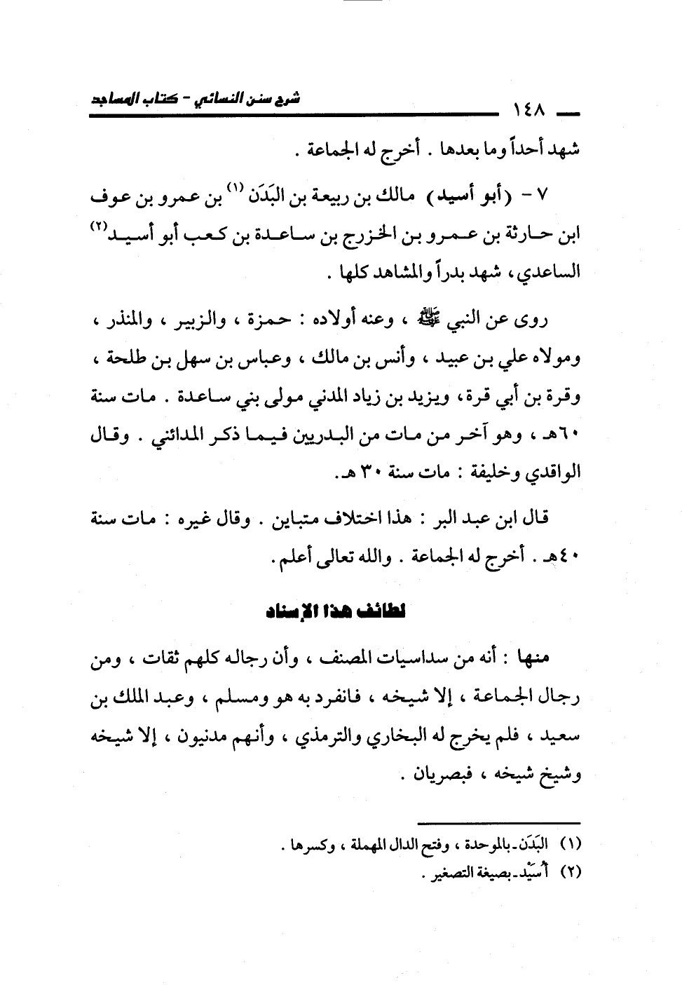 7 - (أبو أسيد) مالك بن ربيعة بن البَدَن (¬1) بن عمرو بن عوف ابن حارثة بن عمرو بن الخزرج بن ساعدة بن كعب أبو أسيد (¬2) الساعدي، شهد بدراً والمشاهد كلها.