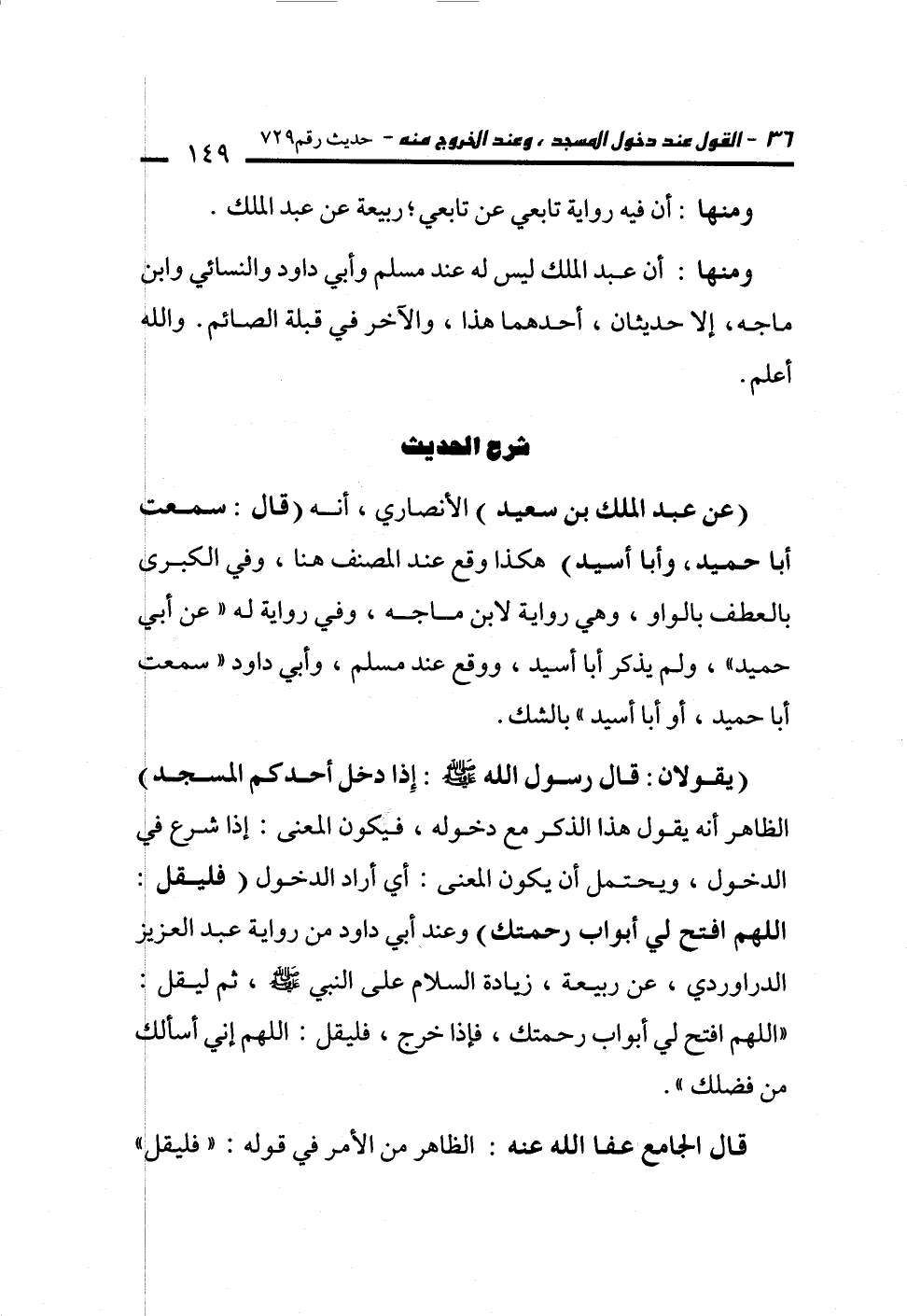(يقولان: قال رسول الله -صلى الله عليه وسلم-: إِذا دخل أحدكم المسجد) الظاهر أنه يقول هذا الذكر مع دخوله، فيكون المعنى: إذا شرع في الدخول، ويحتمل أن يكون المعنى: أي أراد الدخول (فليقل: اللهم افتح لي أبواب رحمتك) وعند أبي داود من رواية عبد العزيز الدراوردي، عن ربيعة، زيادة السلام على النبي -صلى الله عليه وسلم-، ثم ليقل: "اللهم افتح لي أبواب رحمتك، فإذا خرج، فليقل: اللهم إني أسألك من فضلك".