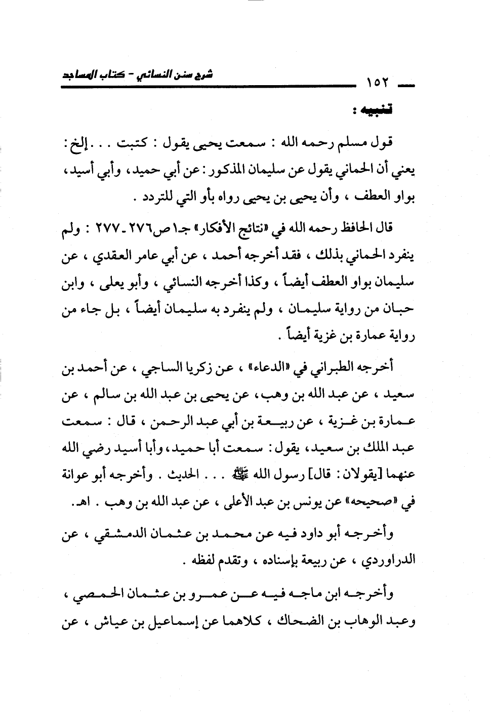 قال الحافظ رحمه الله في "نتائج الأفكار" جـ 1 ص 276 - 277: ولم ينفرد الحماني بذلك، فقد أخرجه أحمد، عن أبي عامر العقدي، عن سليمان بواو العطف أيضًا، وكذا أخرجه النسائي، وأبو يعلى، وابن حبان من رواية سليمان، ولم ينفرد به سليمان أيضًا، بل جاء من رواية عمارة بن غزية أيضًا.