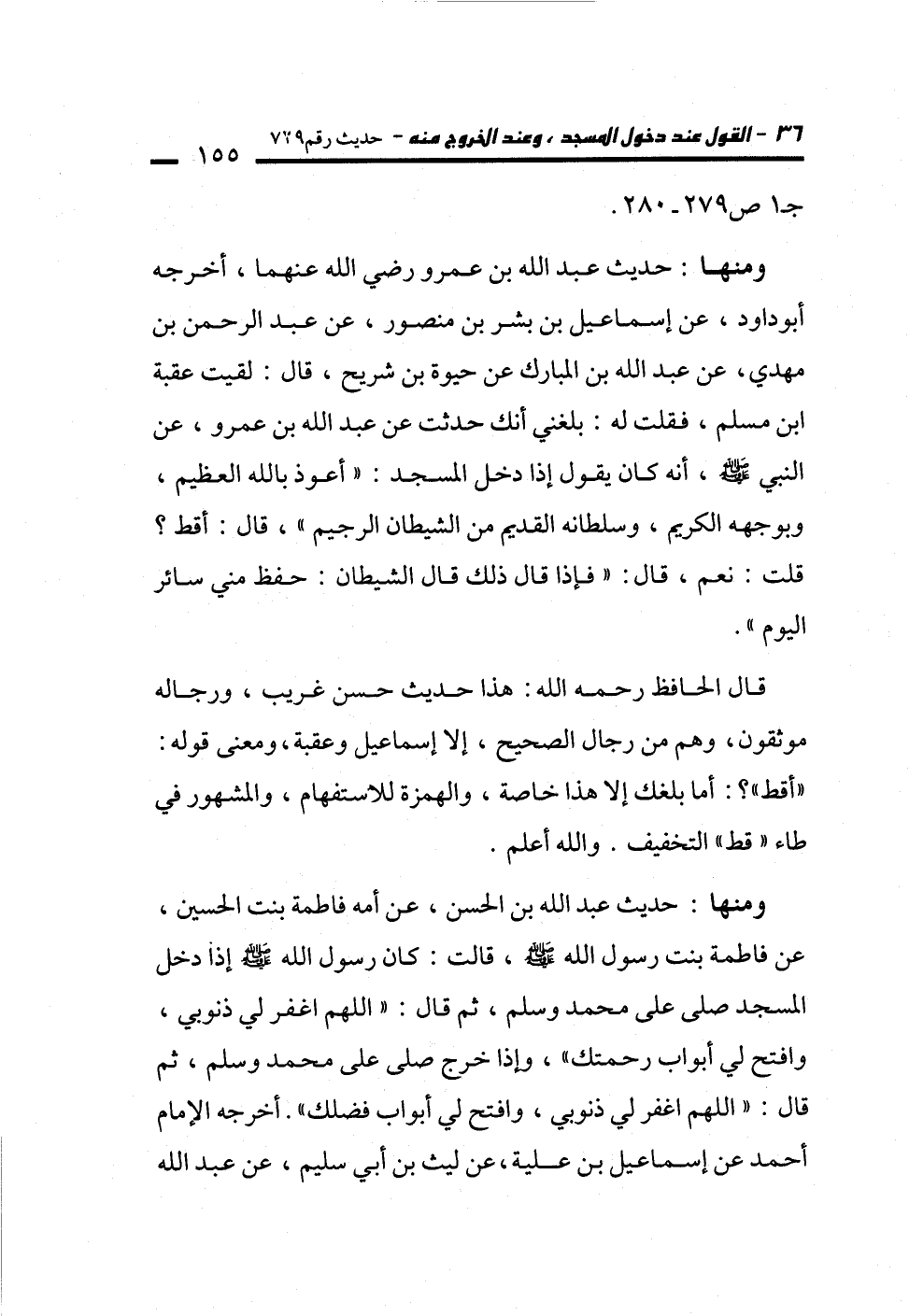 ومنها: حديث عبد الله بن عمرو رضي الله عنهما، أخرجه أبو داود، عن إسماعيل بن بشر بن منصور، عن عبد الرحمن بن مهدي، عن عبد الله بن المبارك عن حيوة بن شريح، قال: لقيت عقبة ابن مسلم، فقلت له: بلغني أنك حدثت عن عبد الله بن عمرو، عن النبي -صلى الله عليه وسلم-، أنه كان يقول إذا دخل المسجد: "أعوذ بالله العظيم، وبوجهه الكريم، وسلطانه القديم من الشيطان الرجيم"، قال: أقط؟ قلت: نعم، قال: "فإذا قال ذلك قال الشيطان: حفظ مني سائر اليوم".
