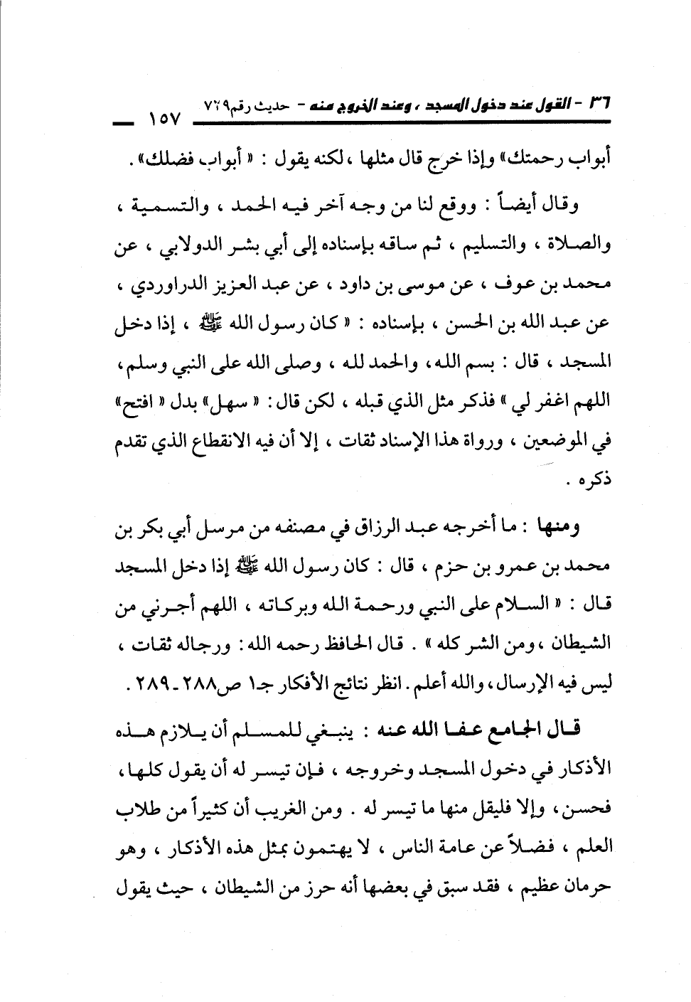 قال الجامع عفا الله عنه: ينبغي للمسلم أن يلازم هذه الأذكار في دخول المسجد وخروجه، فإن تيسر له أن يقول كلها، فحسن، وإلا فليقل منها ما تيسر له. ومن الغريب أن كثيراً من طلاب العلم، فضلًا عن عامة الناس، لا يهتمون بمثل هذه الأذكار، وهو حرمان عظيم، فقد سبق في بعضها أنه حرز من الشيطان، حيث يقول
