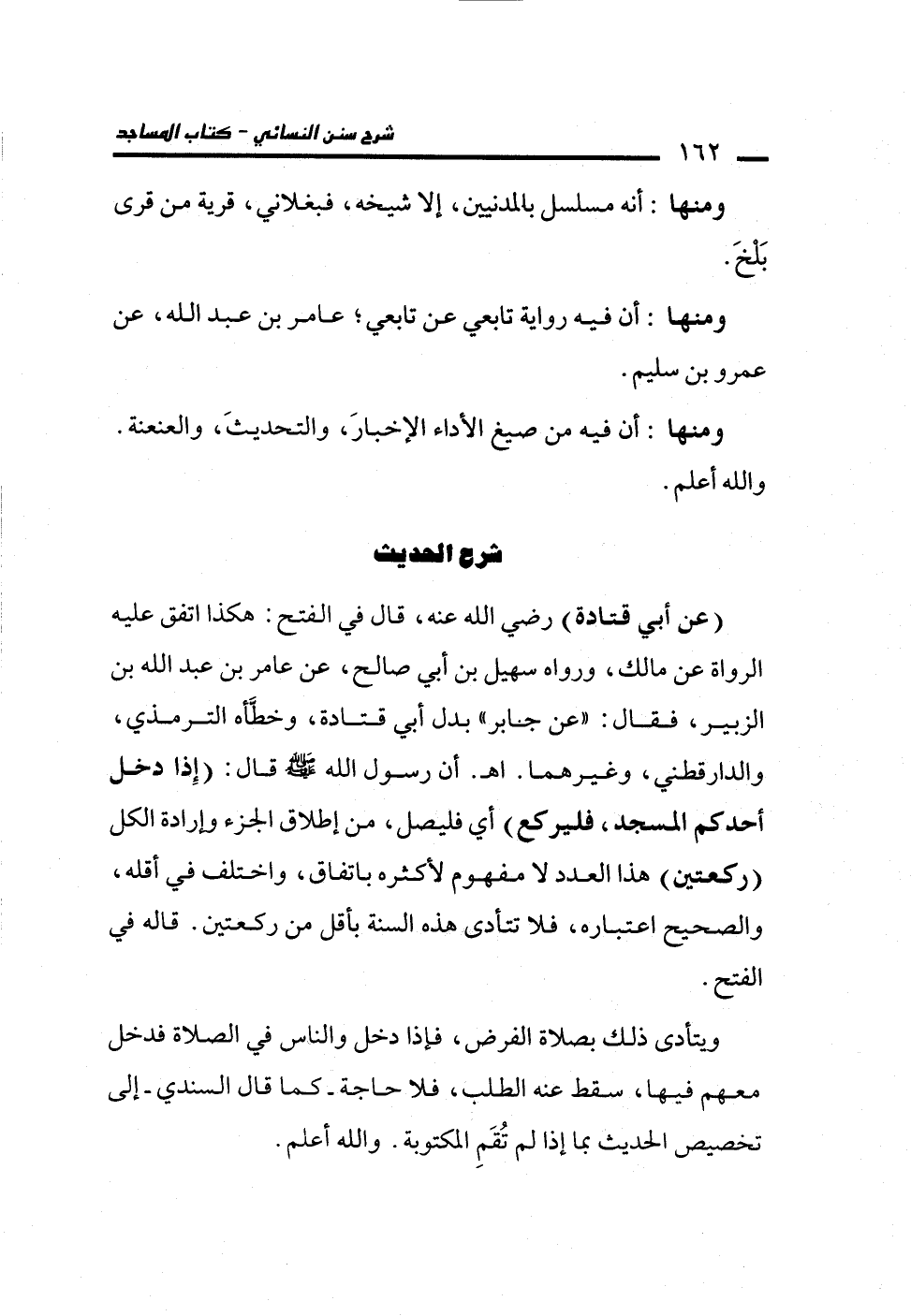 (عن أبي قتادة) رضي الله عنه، قال في الفتح: هكذا اتفق عليه الرواة عن مالك، ورواه سهيل بن أبي صالح، عن عامر بن عبد الله بن الزبير، فقال: "عن جابر" بدل أبي قتادة، وخطَّأه الترمذي، والدارقطني، وغيرهما. اهـ. أن رسول الله -صلى الله عليه وسلم- قال: (إِذا دخل أحدكم المسجد، فليركع) أي فليصل، من إطلاق الجزء وإرادة الكل (ركعتين) هذا العدد لا مفهوم لأكثره باتفاق، واختلف في أقله، والصحيح اعتباره، فلا تتأدى هذه السنة بأقل من ركعتين. قاله في الفتح.