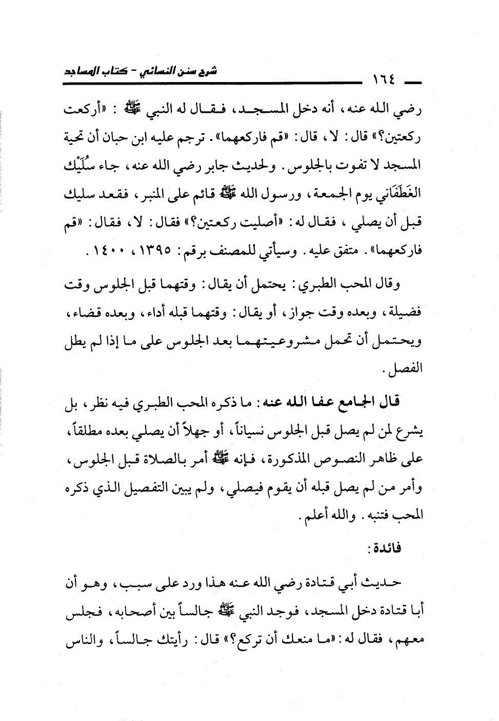 رضي الله عنه، أنه دخل المسجد، فقال له النبي -صلى الله عليه وسلم-: "أركعت ركعتين؟ " قال: لا، قال: "قم فاركعهما". ترجم عليه ابن حبان أن تحية المسجد لا تفوت بالجلوس. ولحديث جابر رضي الله عنه، جاء سُلَيْك الغَطَفَاني يوم الجمعة، ورسول الله -صلى الله عليه وسلم- قائم على المنبر، فقعد سليك قبل أن يصلي، فقال له: "أصليت ركعتين؟ " فقال: لا، فقال: "قم فاركعهما". متفق عليه. وسيأتي للمصنف برقم: 1395، 1400.