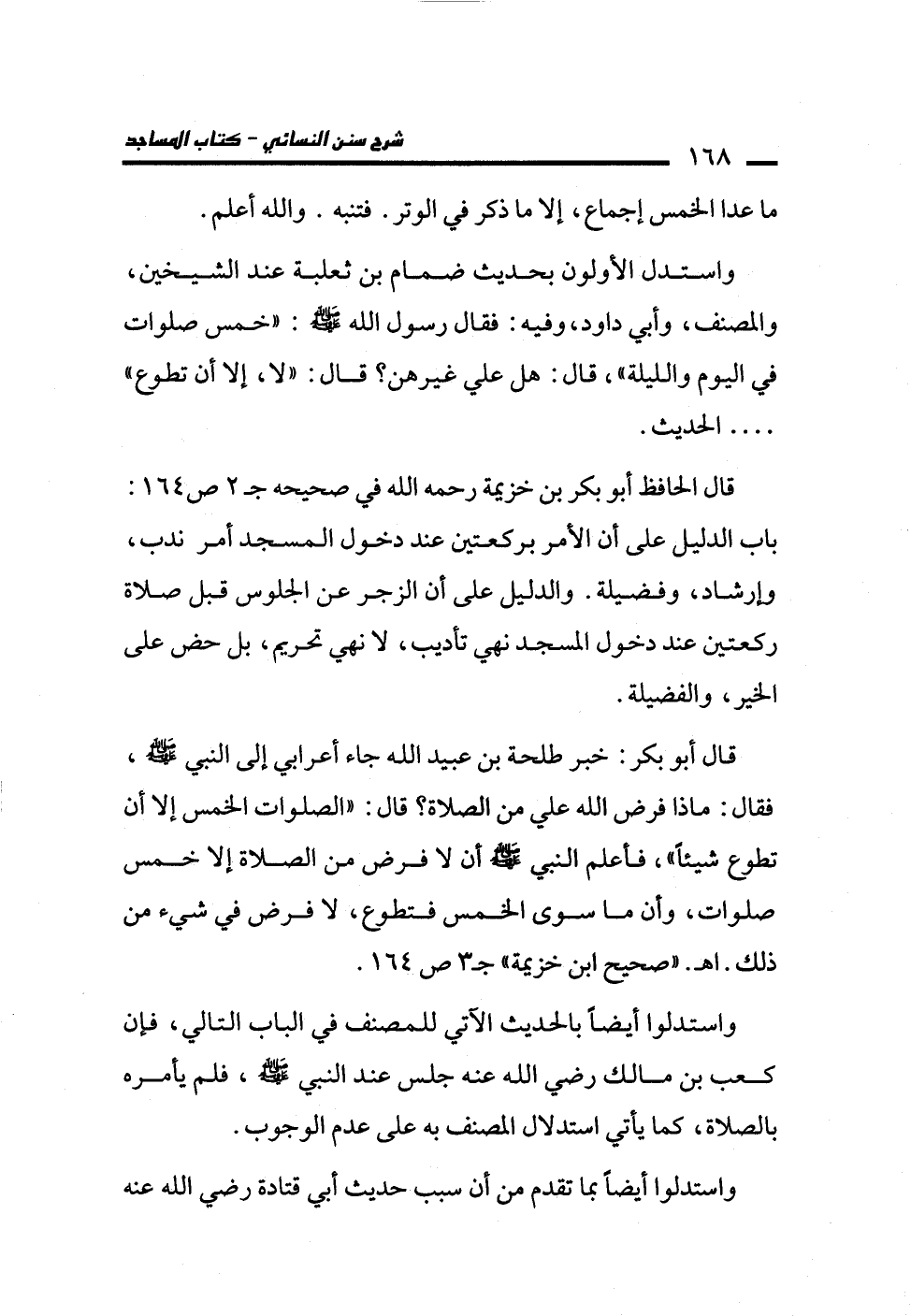 قال أبو بكر: خبر طلحة بن عبيد الله جاء أعرابي إلى النبي -صلى الله عليه وسلم-، فقال: ماذا فرض الله علي من الصلاة؟ قال: "الصلوات الخمس إلا أن تطوع شيئًا"، فأعلم النبي -صلى الله عليه وسلم- أن لا فرض من الصلاة إلا خمس صلوات، وأن ما سوى الخمس فتطوع، لا فرض في شيء من ذلك. اهـ. "صحيح ابن خزيمة" جـ 3 ص 164.