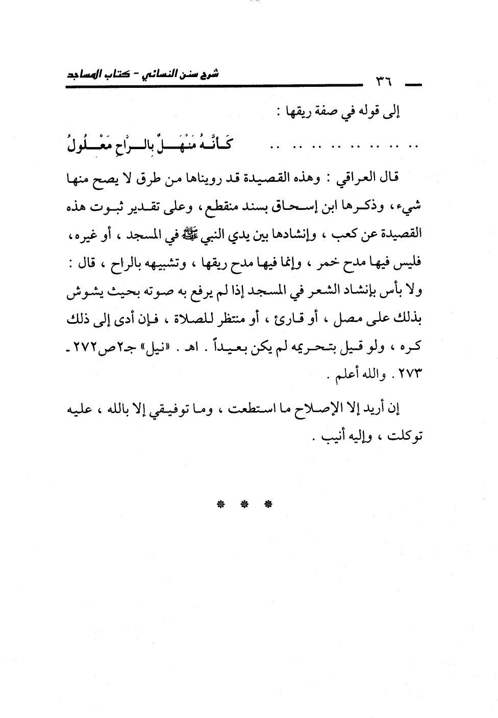 قال العراقي: وهذه القصيدة قد رويناها من طرق لا يصح منها شيء، وذكرها ابن إسحاق بسند منقطع، وعلى تقدير ثبوت هذه القصيدة عن كعب، وإنشادها بين يدي النبي -صلى الله عليه وسلم- في المسجد، أو غيره، فليس فيها مدح خمر، وإنما فيها مدح ريقها، وتشبيهه بالراح، قال: ولا بأس بإنشاد الشعر في المسجد إذا لم يرفع به صوته بحيث يشوش بذلك على مصل، أو قارىء، أو منتظر للصلاة، فإن أدى إلى ذلك كره، ولو قيل بتحريمه لم يكن بعيداً. اهـ. "نيل" جـ 2 ص 272 - 273. والله أعلم.