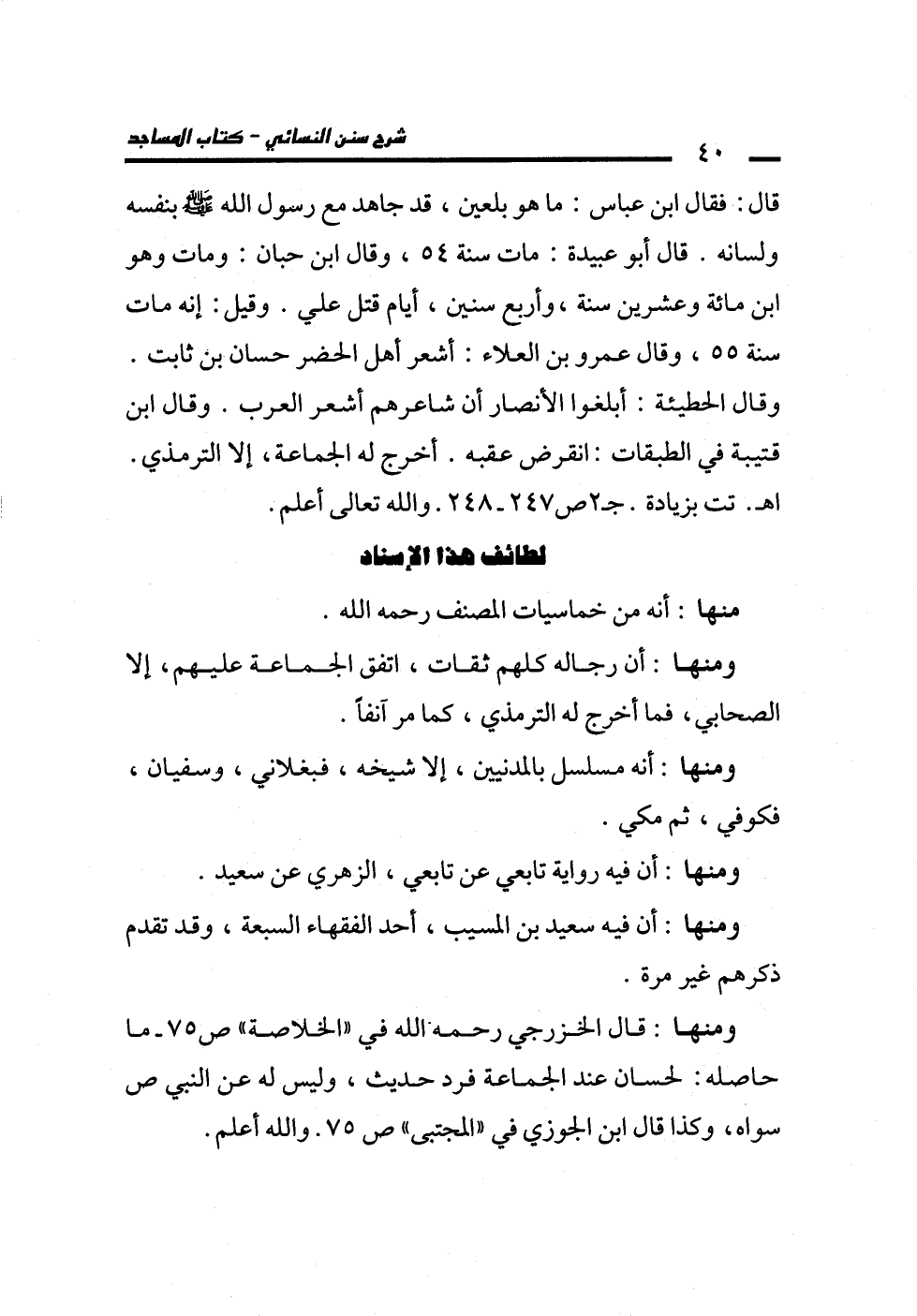 ومنها: قال الخزرجي رحمه الله في "الخلاصة" ص 75 - ما حاصله: لحسان عند الجماعة فرد حديث، وليس له عن النبي -صلى الله عليه وسلم- سواه، وكذا قال ابن الجوزي في "المجتبى" ص 75. والله أعلم.
