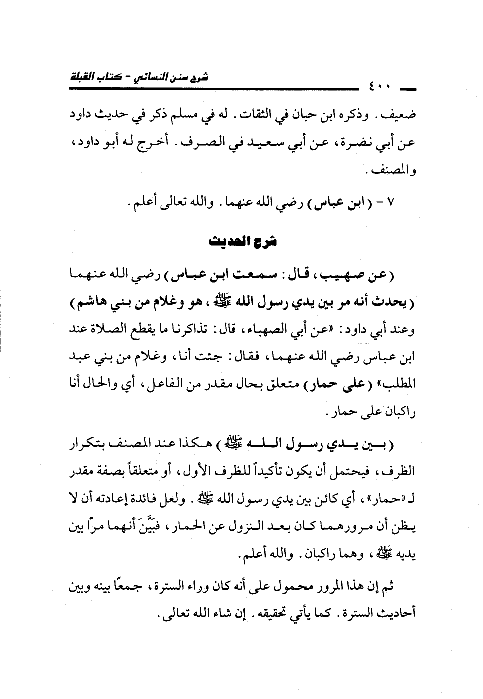 (عن صهيب، قال: سمعت ابن عباس) رضي الله عنهما (يحدث أنه مر بين يدي رسول الله -صلى الله عليه وسلم-، هو وغلام من بني هاشم) وعند أبي داود: "عن أبي الصهباء، قال: تذاكرنا ما يقطع الصلاة عند ابن عباس رضي الله عنهما، فقال: جئت أنا، وغلام من بني عبد المطلب" (على حمار) متعلق بحال مقدر من الفاعل، أي والحال أنا راكبان على حمار.