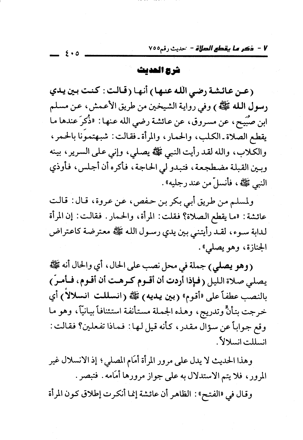 وهذا الحديث لا يدل على مرور المرأة أمَام المصلي؛ إذ الانسلال غير المرور، فلا يتم الاستدلال به على جواز مرورها أمَامه. فتبصر.