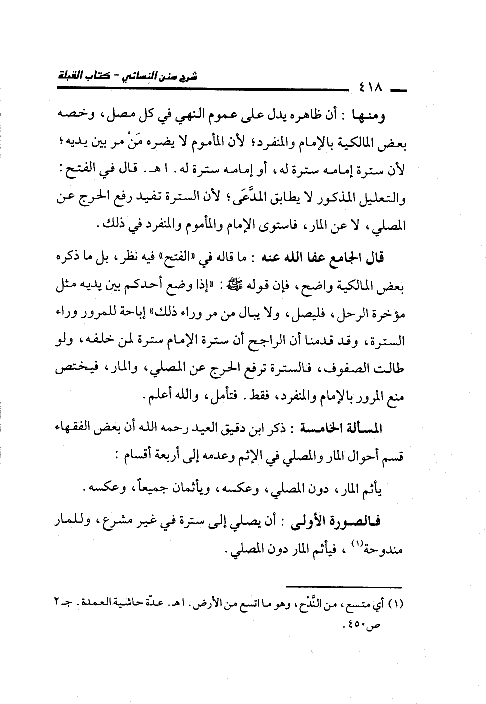 المسألة الخامسة: ذكر ابن دقيق العيد رحمه الله أن بعض الفقهاء قسم أحوال المار والمصلي في الإثم وعدمه إلى أربعة أقسام: